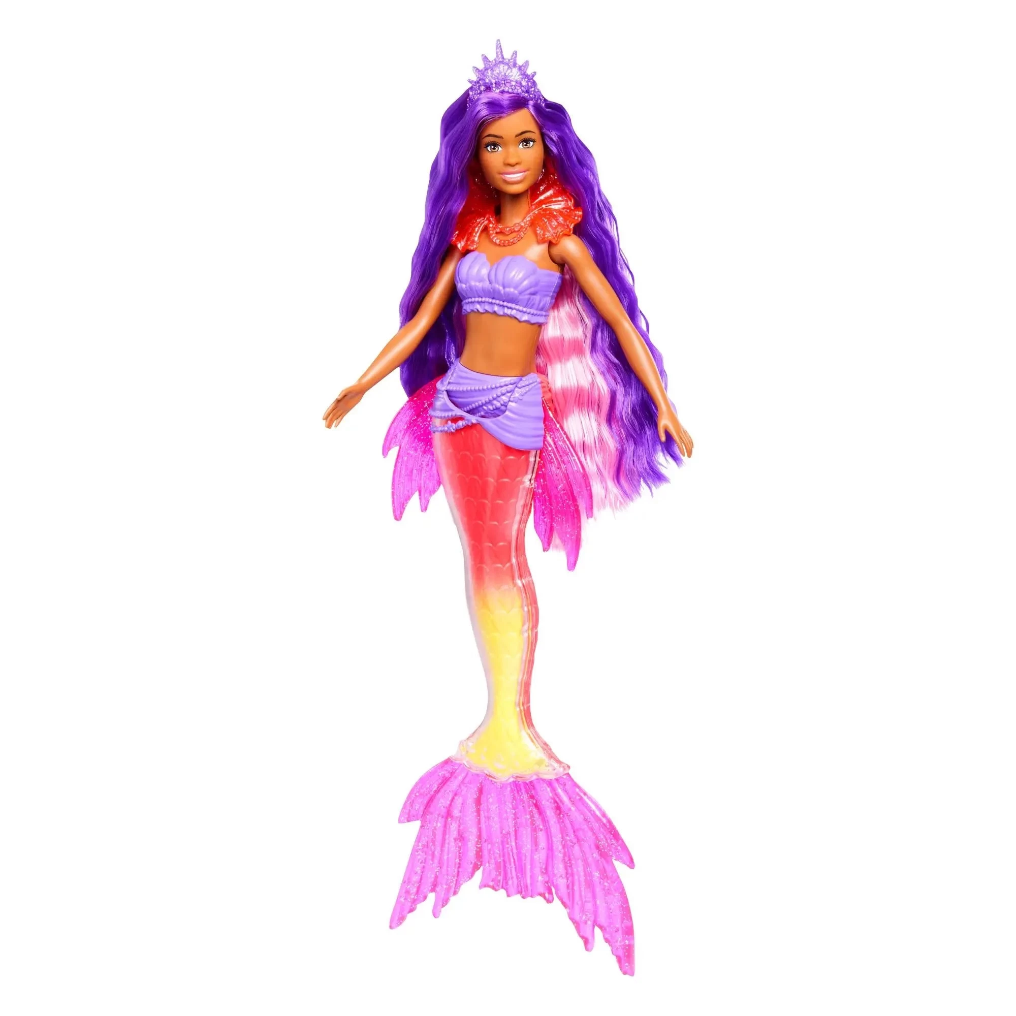 • Barbie® doll features a magical mermaid look, complete with extra-long purple hair and a beautiful ombre tail with premium touches and sculpted scales.