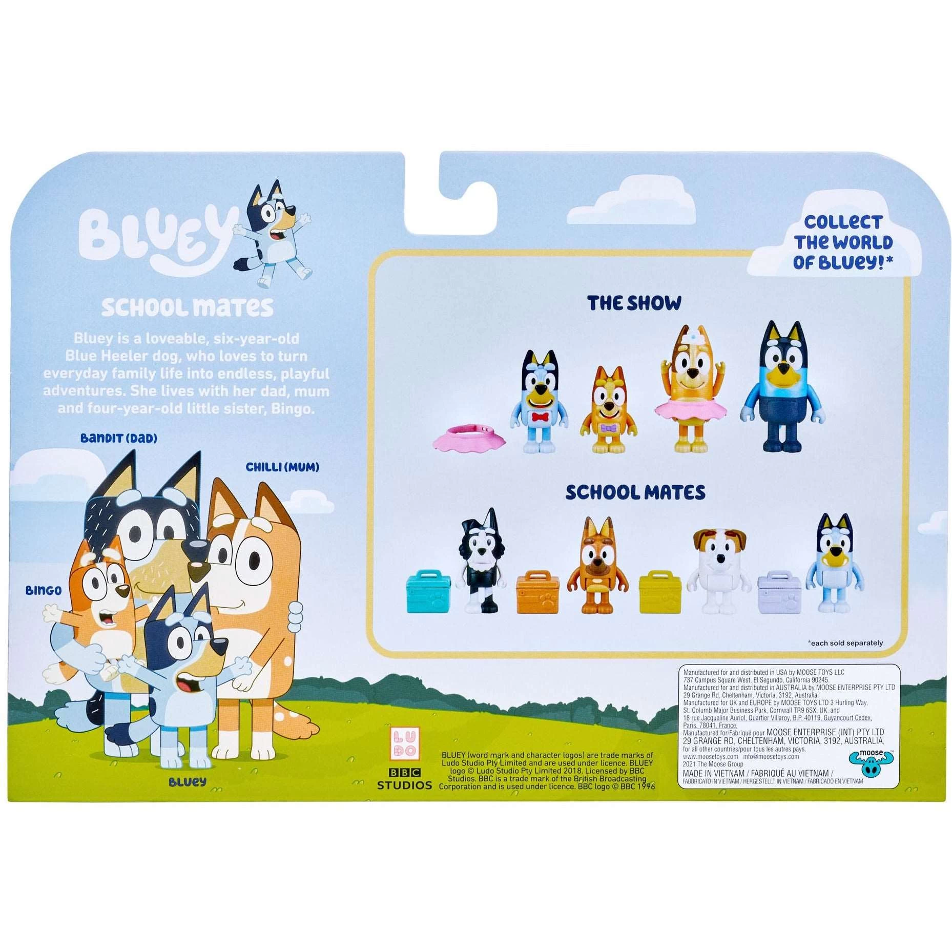Bring the fun and imaginative play of Bluey and her friends home with these adorable Bluey Figure Packs. The Bluey School Mates 4 Pack includes Bluey and three of her friends – Jack, Pretzel and Mackenzie. They are all ready for some lunchtime fun in the school-yard. Each Figure has their own Lunchbox that they can hold in their hands. Every 2.5-3″ Figure in this Pack is articulated and has moving arms and body. They are just the right size for pre-school hands to move and play with. Children and toddlers will love to recreate some of the most memorable moments from the show with these adorable Bluey toys!