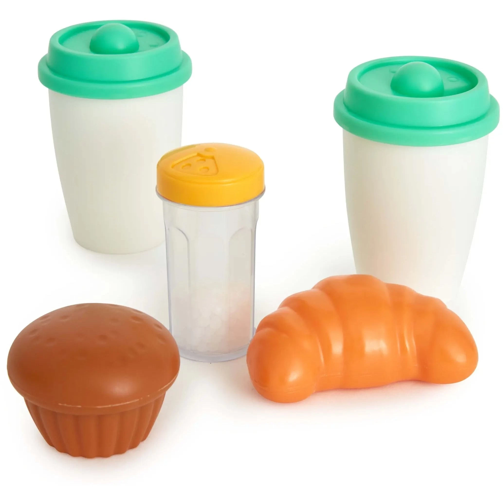 • INCLUDES: Fillable coffee maker, coffee pot, toaster with pop up toast, two coffee cups, sugar shaker, muffin & croissant play food.