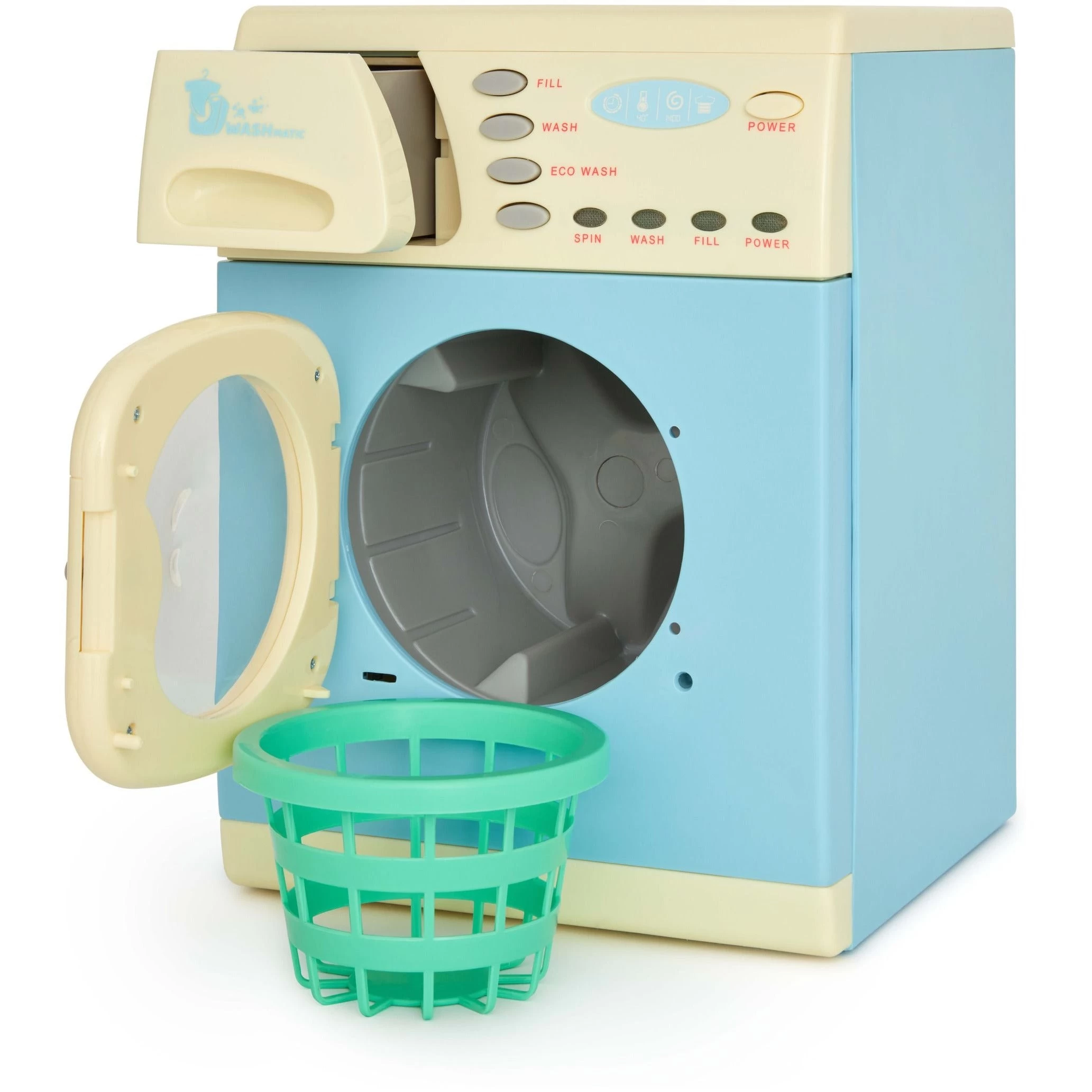 • INCLUDES: Spinning drum with two speeds, buttons, lights, sounds, opening powder drawer, pretend washing powder, and laundry basket.