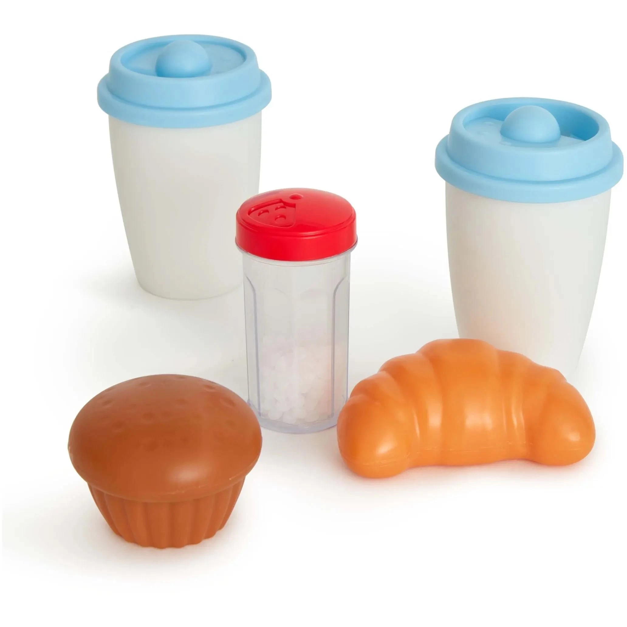 • INCLUDES: Fillable coffee maker, coffee pot, two coffee cups, sugar shaker, muffin & croissant play food.