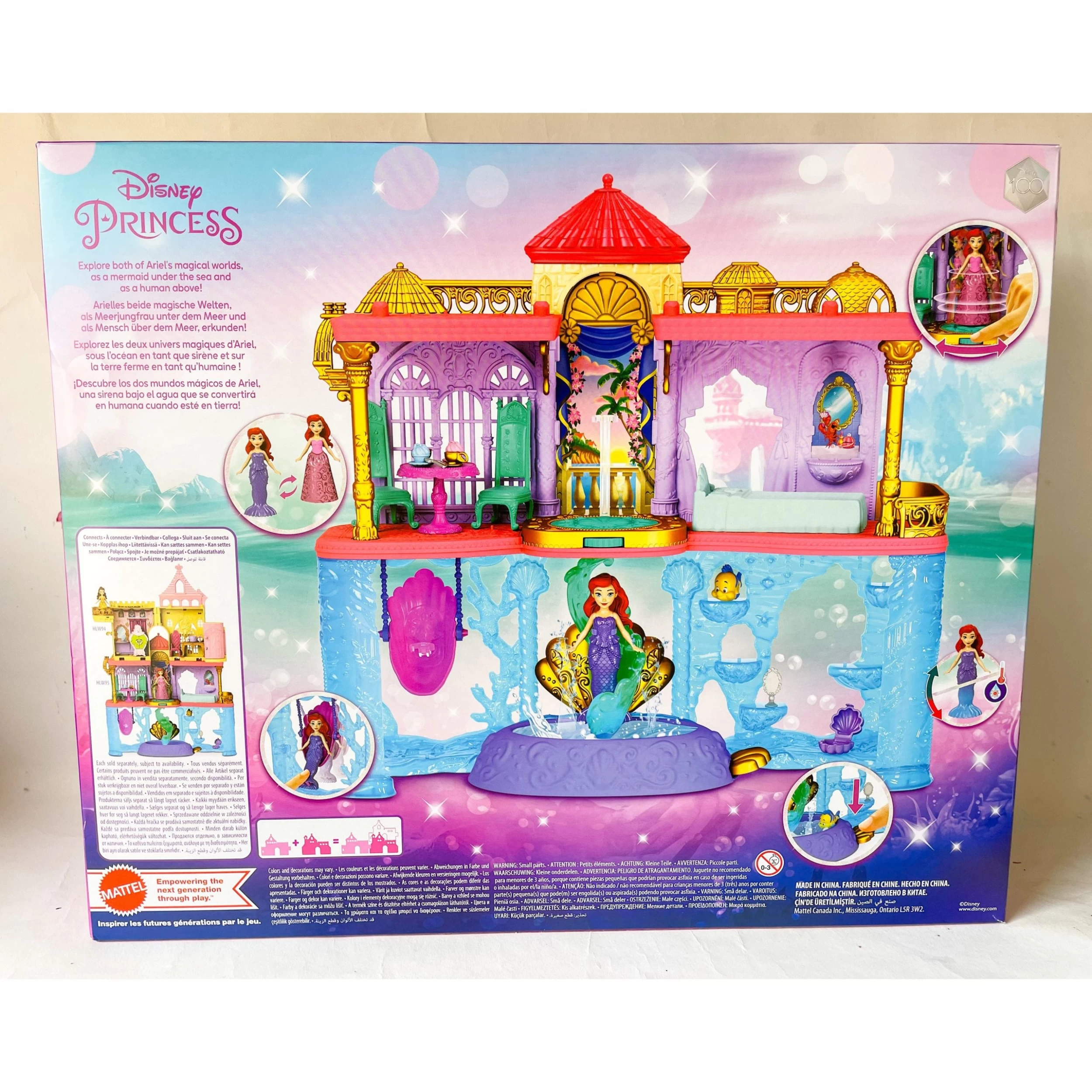 Ariel’s land and sea kingdoms will delight fans in this playset, inspired by Disney’s The Little Mermaid! A stackable doll house in charming small scale, the top of Ariel’s castle is the world above the water and the bottom is the world below the waves. It comes with furniture, play pieces, a Flounder figure, and an Ariel doll with 2 fashions. Doll cannot stand alone. Colours and decorations may vary.