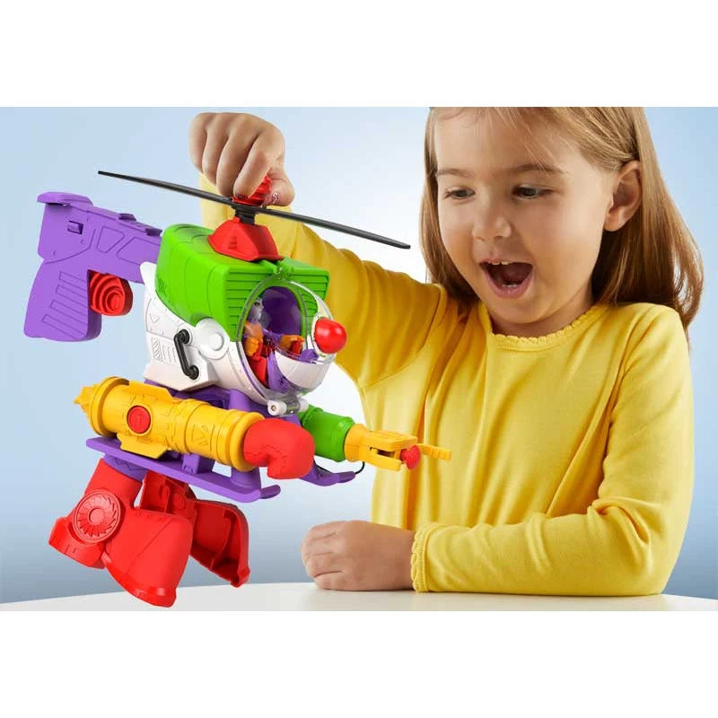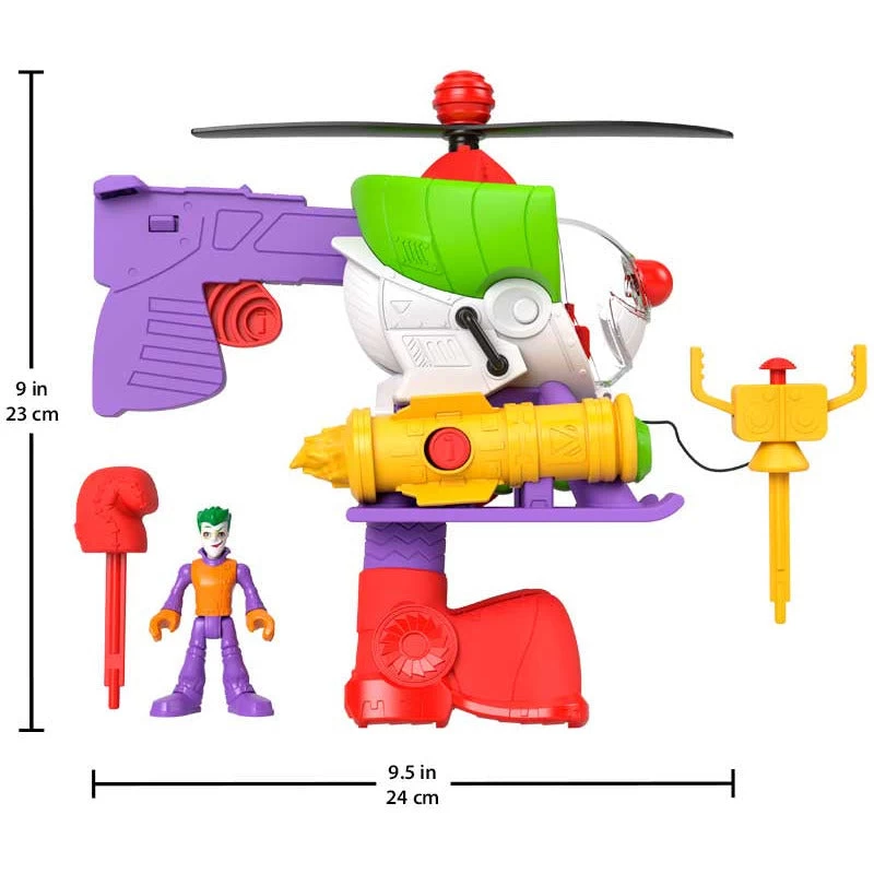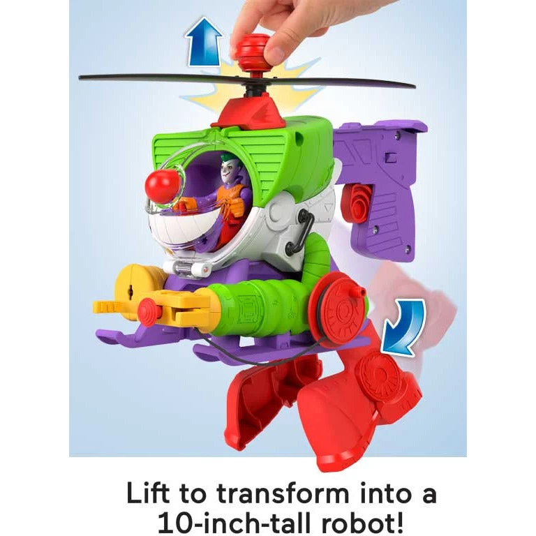 Preschool kids can “soar” into mischievous adventures around Gotham City with The Joker and this Imaginext DC Super Friends Robo Copter from Fisher-Price. Kids can squeeze the handle to spin the propellers on the toy helicopter and send The Joker into action. With Batman in sight, lift the propeller to drop the legs and transform the vehicle into a villainous robot with projectile launching action! (Batman figure sold separately and subject to availability.)