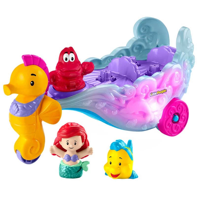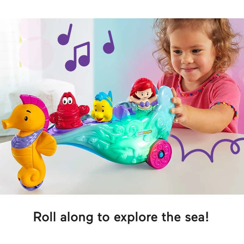 Young fans can roll into enchanting sea adventures with this Disney Princess Ariel’s Light-Up Sea Carriage playset by Little People. This adorable push-along carriage comes with 2 Little People figures styled like Ariel and Flounder to ride around inside. When kids press down on Sebastian, the carriage lights up with fun sounds and the memorable music of “Under the Sea” from Disney’s The Little Mermaid.