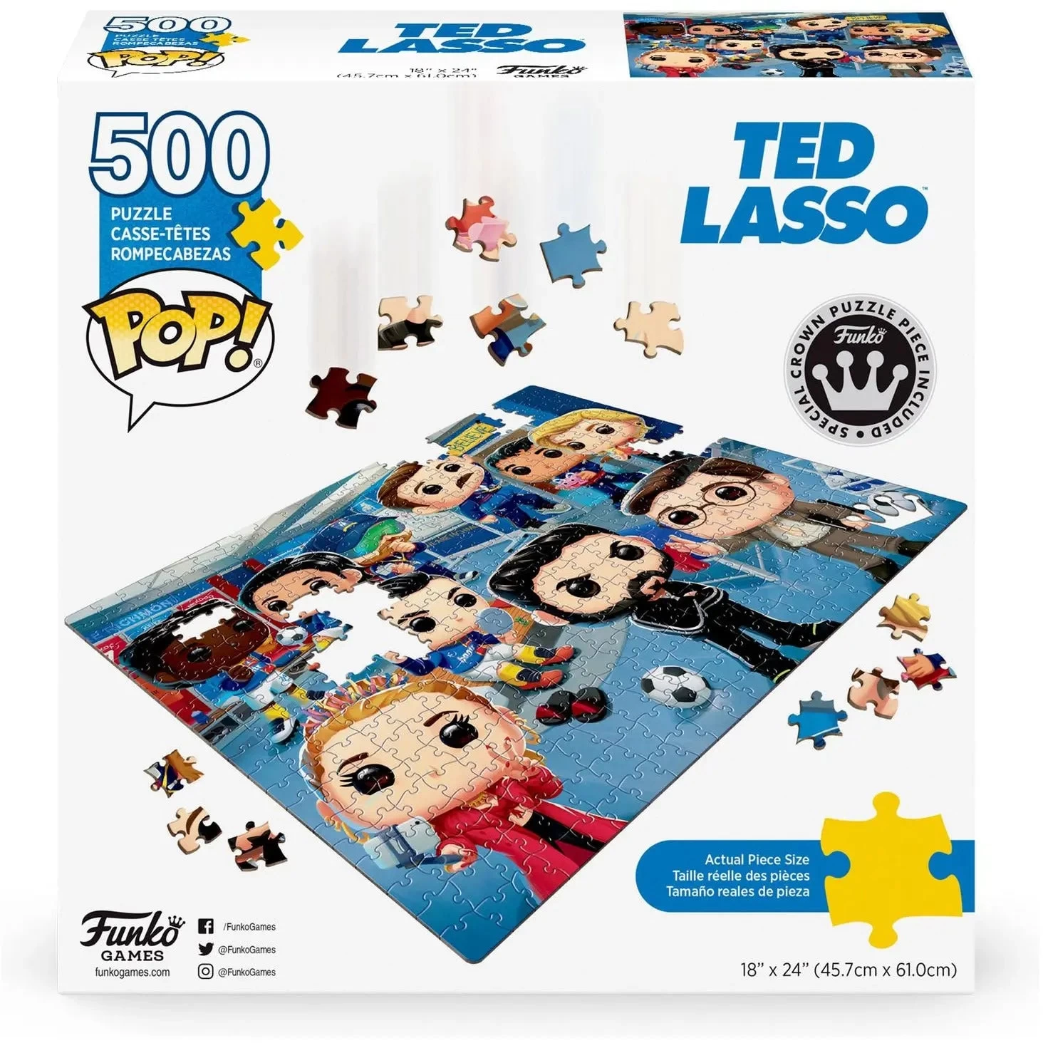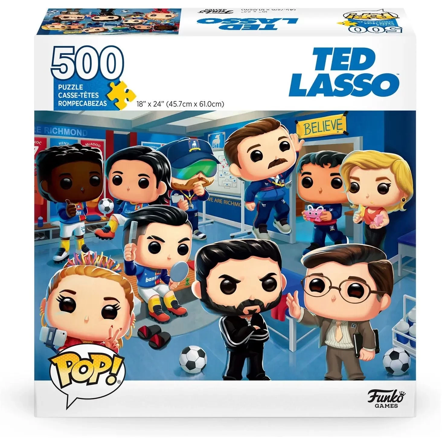 Watch your favorite pop culture characters take shape as you put together 500 pieces of fun! This 18” x 24” puzzle uses high-quality materials and vibrant Pop! styled artwork. It’s perfect puzzling for the whole family, featuring an original illustration inspired by the hit show Ted Lasso. Interesting Features • Beloved Ted Lasso characters are rendered in rich color and signature Funko Pop! style!