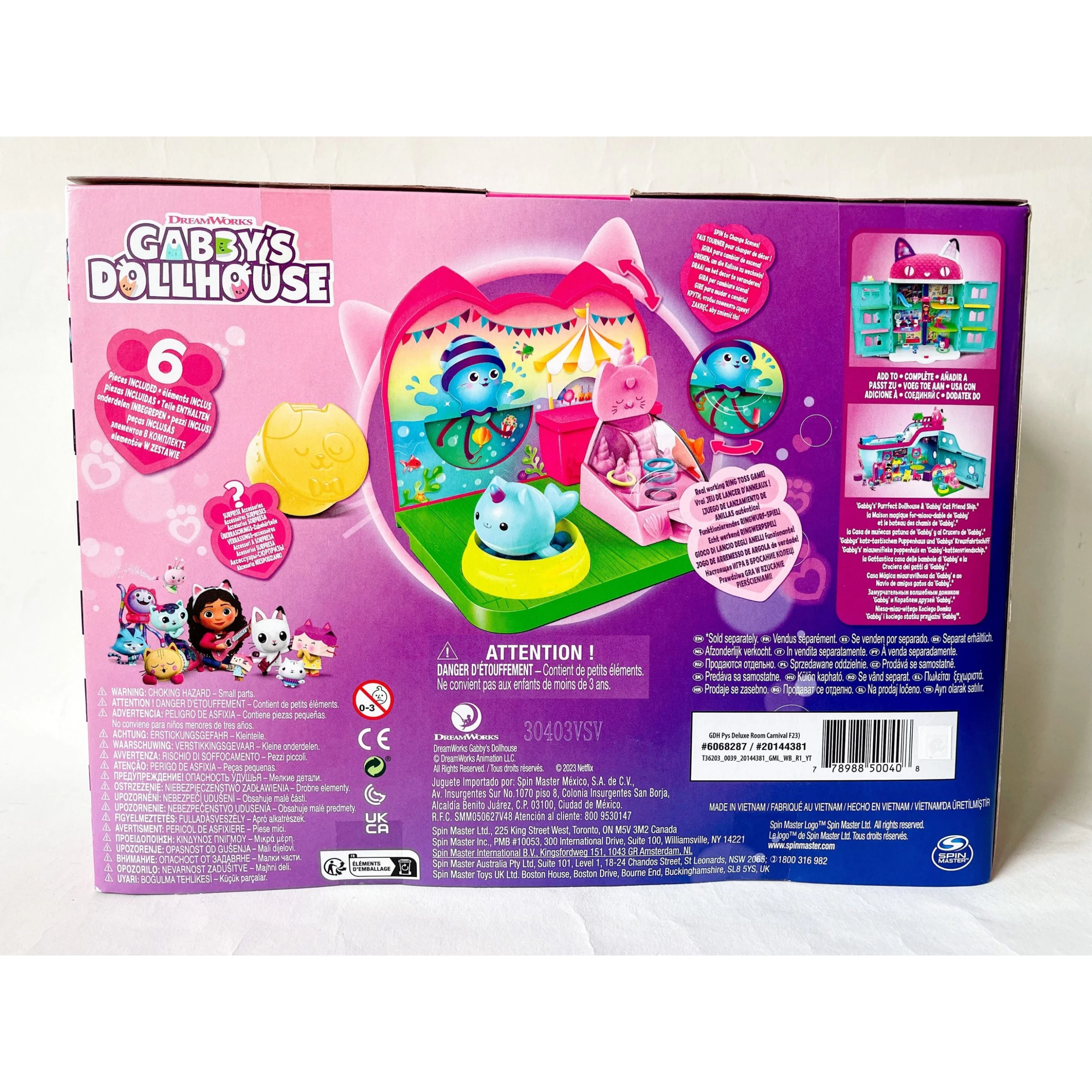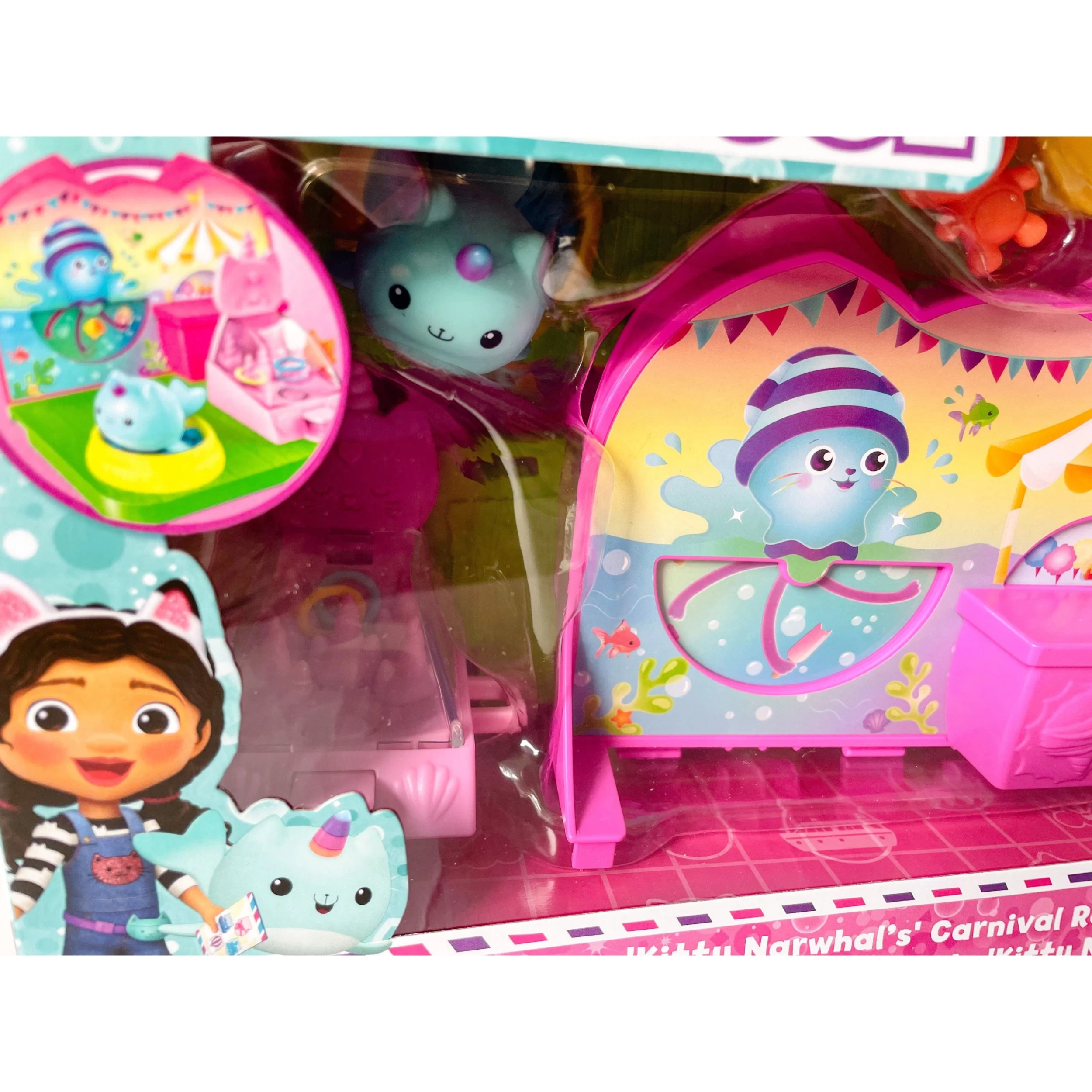 Get ready for some fun and excitement with Kitty Narwhal, in the Cat-tastic Carnival Room playset! This playset features an exciting carnival-themed dollhouse room and dollhouse furniture that you can use with both the Cat Friend Ship and in Gabby’s Purrfect Dollhouse (each sold separately)! Featuring a super-cute Kitty Narwhal toy figure, that stands almost 2-inches long, a ball pool, a kitty ring toss game, a snack bar and much more! Put Kitty Narwhal in the ball pool, try your luck at the ring toss game to win a prize, then turn the thumbwheel to rotate the chip art and enjoy a change of scenery! Then, just like Gabby does in the beginning of each episode, unbox your special Dollhouse Delivery to discover the surprise toy – a caramel apple! For one last surprise, scan the QR code found inside the Dollhouse Delivery to unlock a special reward in the free Gabby’s Dollhouse App (available on iOS and Android). For even more ways to play, look for the Gabby Cat Friend Ship, Gabby’s Purrfect Dollhouse and themed Dollhouse Rooms, to build out your doll house world even more (Each sold separately)! Gabby’s Dollhouse stuffed animals, dolls, toy figures and playsets are the perfect toys for girls and boys that love using their imagination to create their own dollhouse world, so prepare for endless pretend play adventures with the Gabby’s Dollhouse, Kitty Narwhal’s Carnival Room!