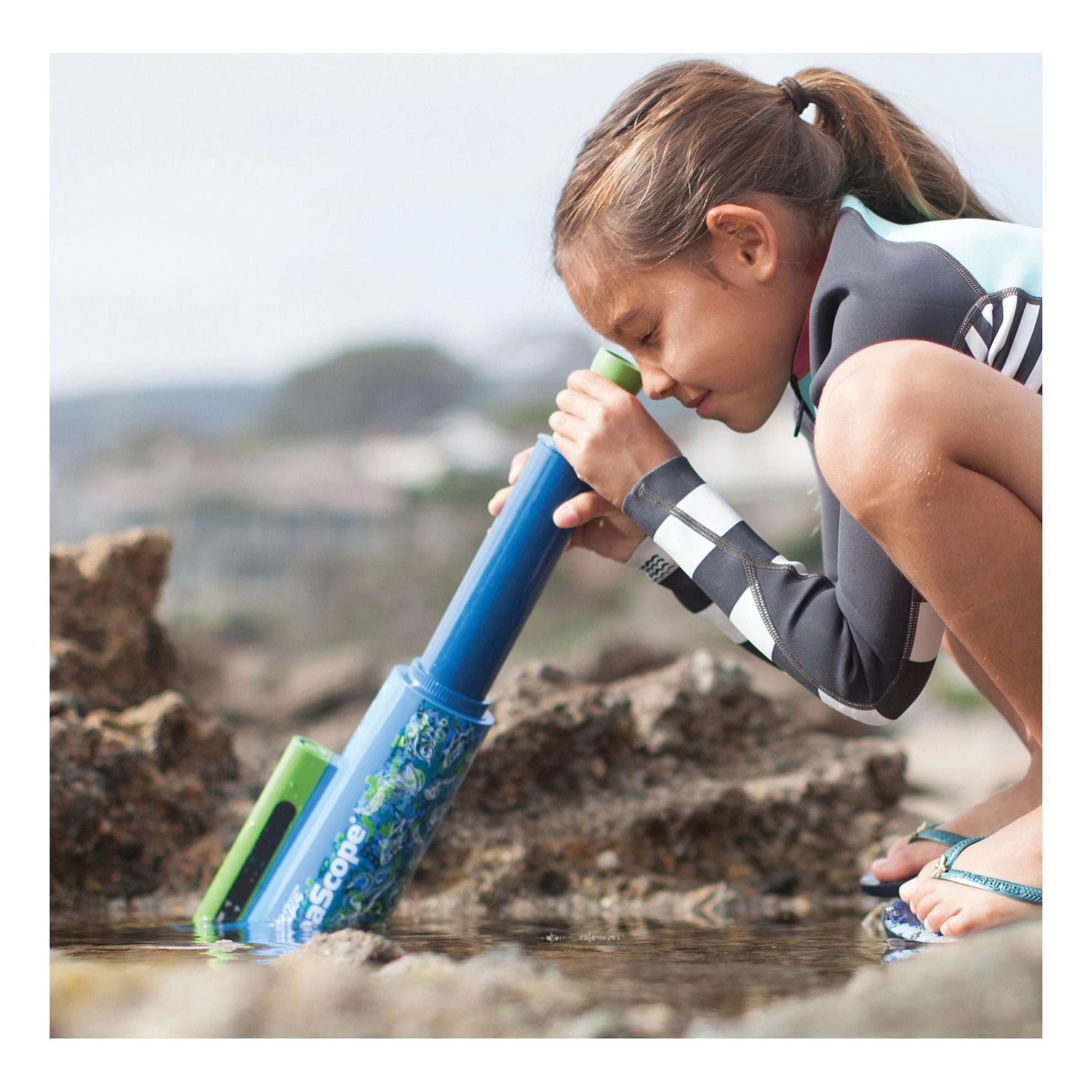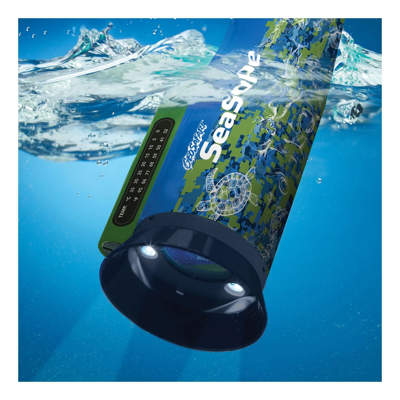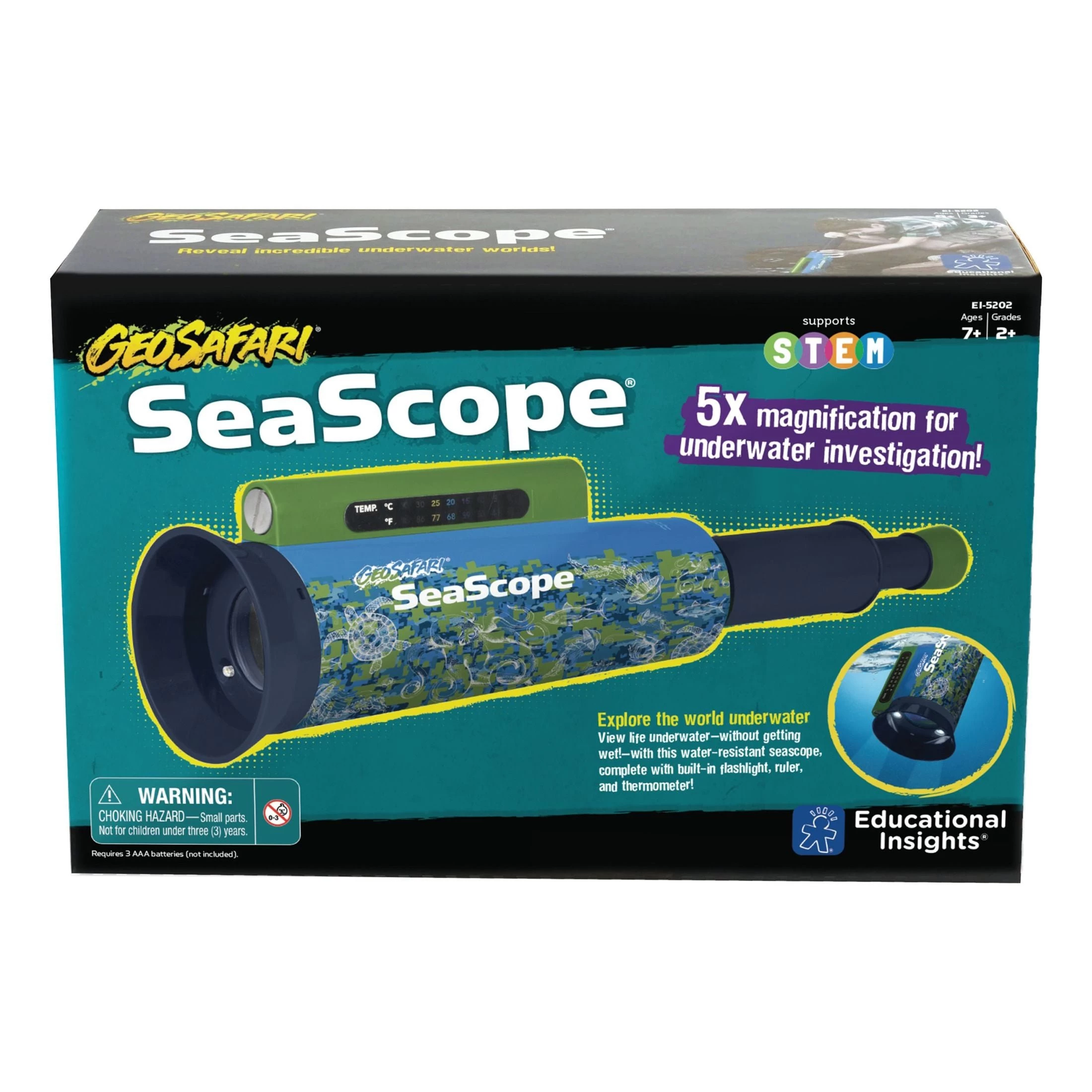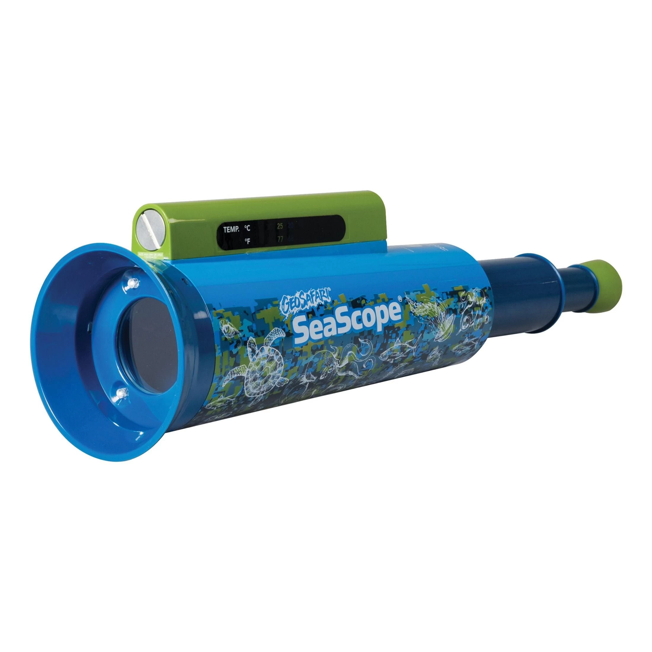 Learning Resources® GeoSafari® SeaScope. New and improved design! Encourage early exploration with this versatile telescope, especially designed for underwater viewing! With 5x magnification and extendable body, this colourful telescope can be used both on land and underwater, without children getting their head wet. Built-in LED flashlight makes it easy to view objects in poor light. Attached thermometer strip allow for on the spot measuring. Requires 3 AA batteries, not included. Measures 33cm L when compact and extends to 56cm L. Includes multilingual activity guide. Suitable for ages 8+.