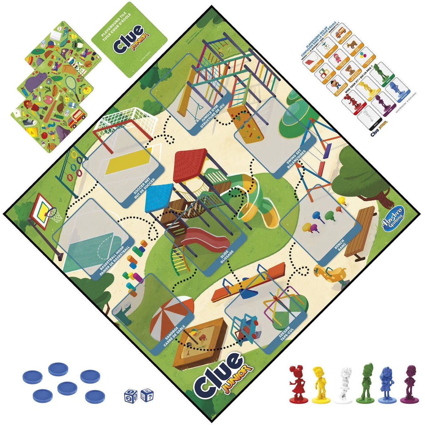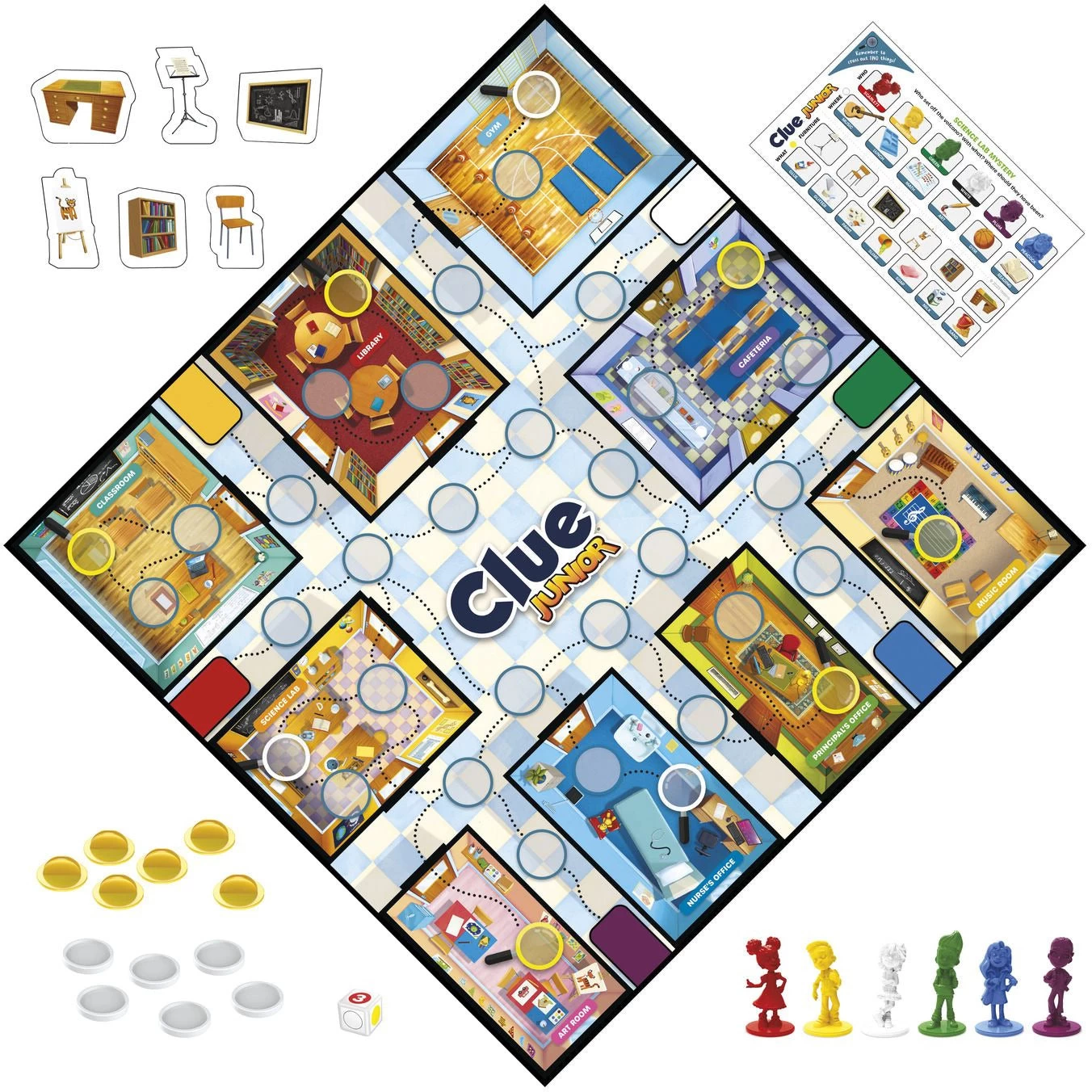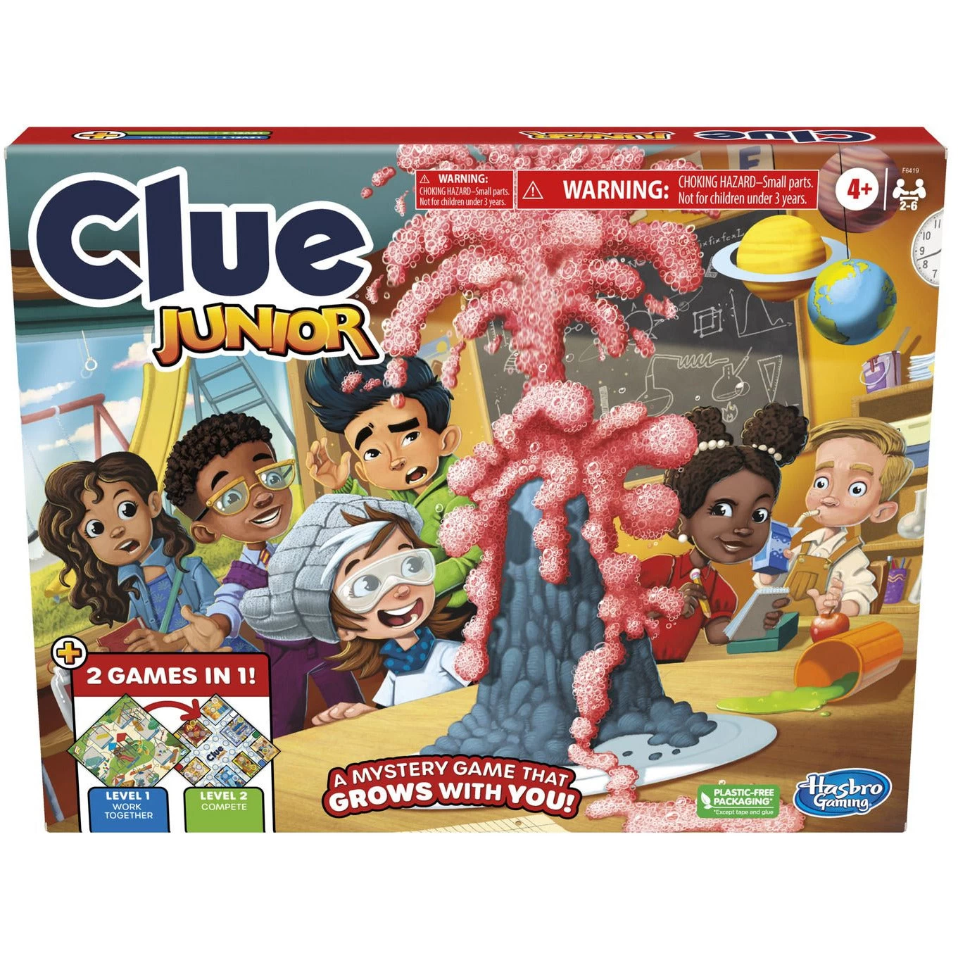 Now preschoolers can get in on the mystery-solving fun with this Clue Junior game, featuring 2 levels of grow-with-me fun! This mystery board game for kids ages 4 and up includes a double-sided gameboard for 2 levels of play. On the Level 1 side, kids work together to solve a Playground Mix-up. One of the characters mistakenly put an item in their backpack. All players work as a team, exploring the playground by searching for clues in seek-and-find picture tiles. Together, they must figure out what item is missing and who took it to solve the mystery. When junior detectives are ready for a bit more challenge, they can flip the board over to Level 2 and compete to solve the Science Lab Mystery. Who set off the volcano, what did they pour into it, and where should they have been? For 2-6 players, this Clue Junior game is a fun game for family time, and it makes a great gift for preschoolers, kids, and families!