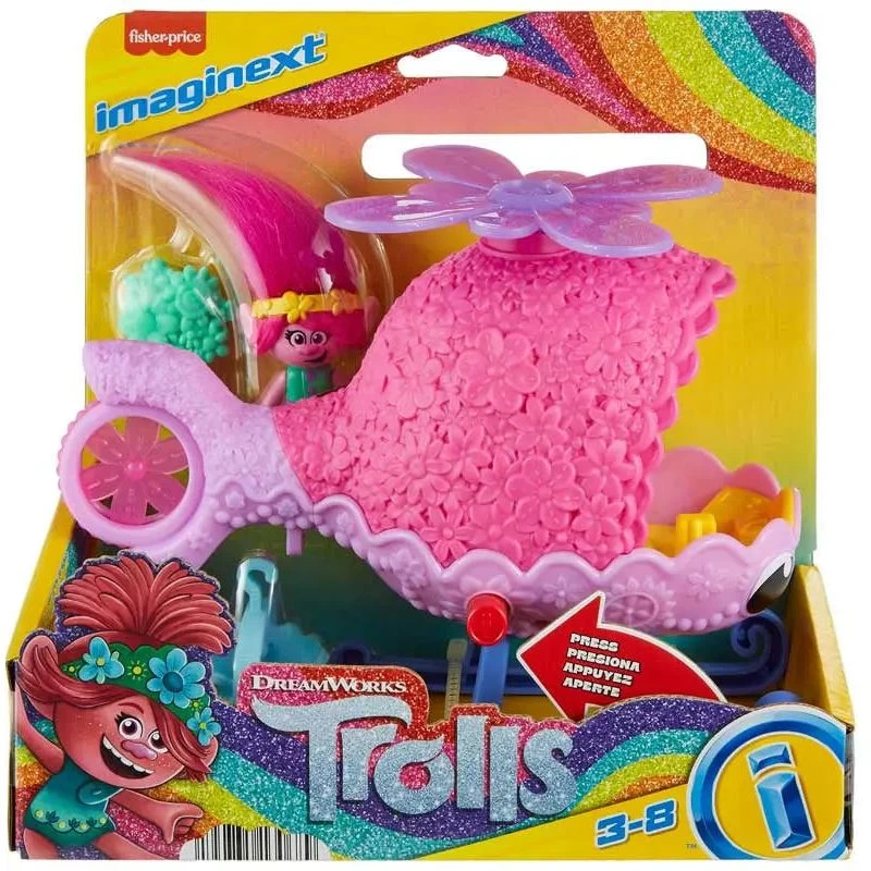 Let your little ones soar to the skies with Queen Poppy and her hilarious helicopter! Watch them giggle as they press the Power Pad and the top propellers start spinning, sending Poppy “flying” into fun. With two themed accessories, your kids will be living the DreamWorks Trolls© life in no time!