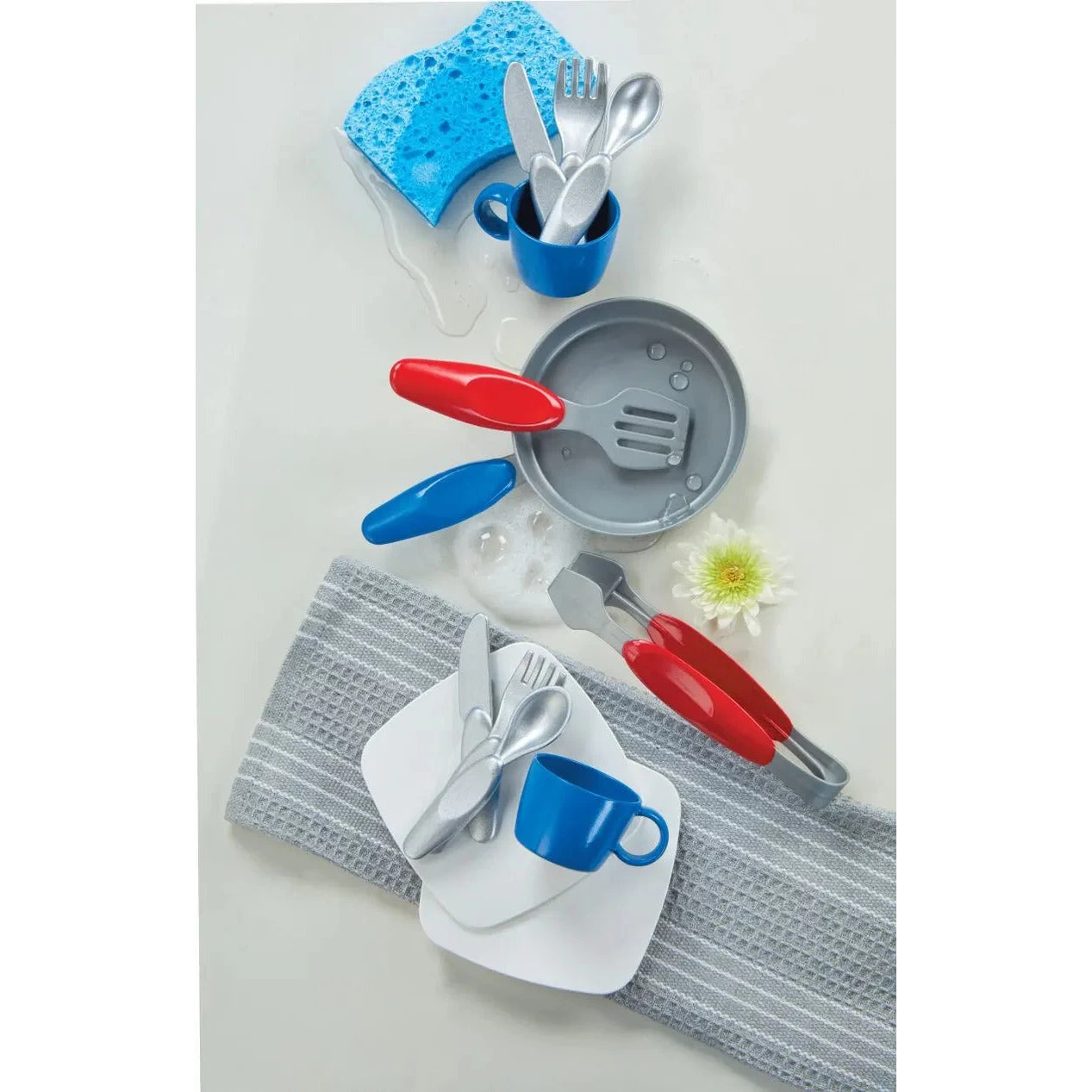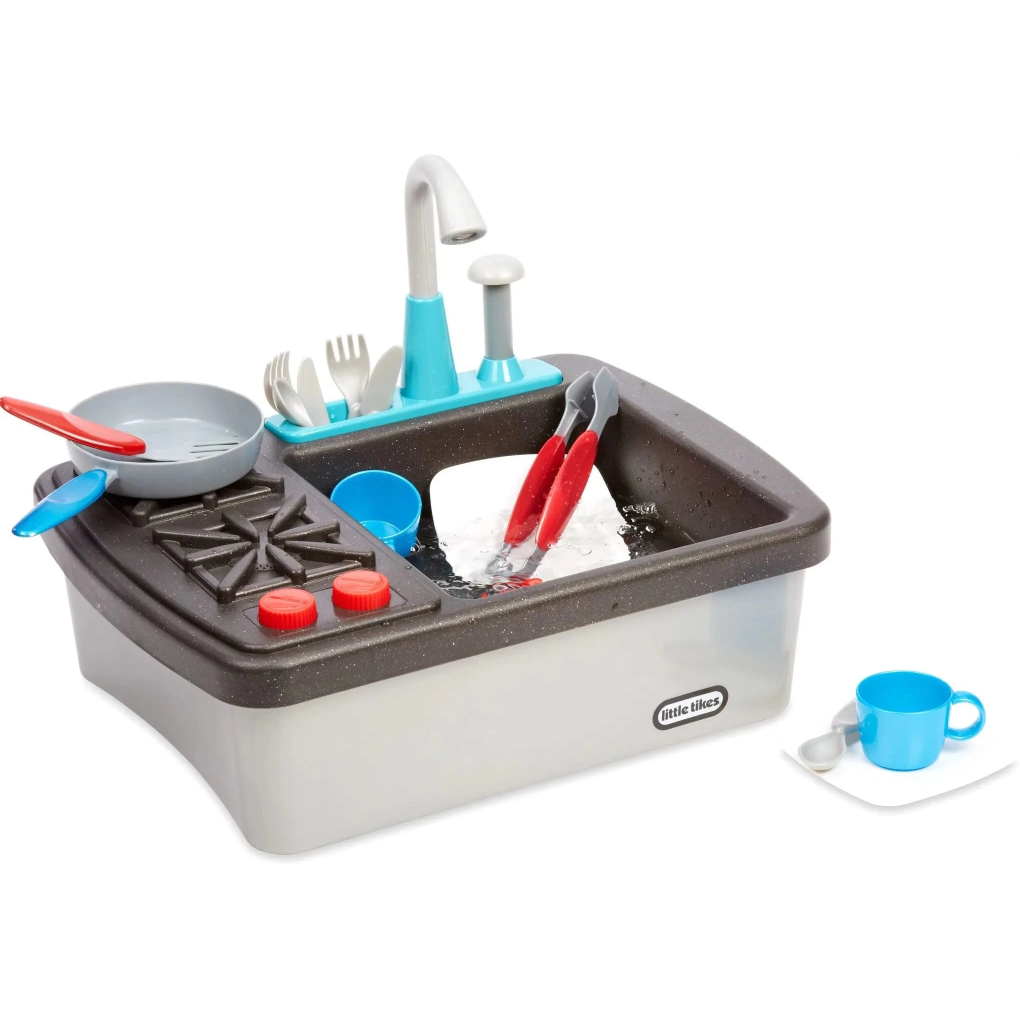 Kids can pretend to cook and wash dishes just like their parents with the realistic Little Tikes First Sink & Stove. This sleek, modern pretend play combo sink and stove is packed with features: a working water pump, clicking knobs, and more. Plus, it makes realistic sounds when kids turn the knobs on the stovetop burners. Pretending to cook, wash dishes, and do other chores helps kids gain a sense of responsibility, an important part of social-emotional learning. ‘The First Sink & Stove fits all 13 included accessories for easy cleanup too. Encourage kids to engage in imaginative pretend play with the First Sink & Stove by Little Tikes!