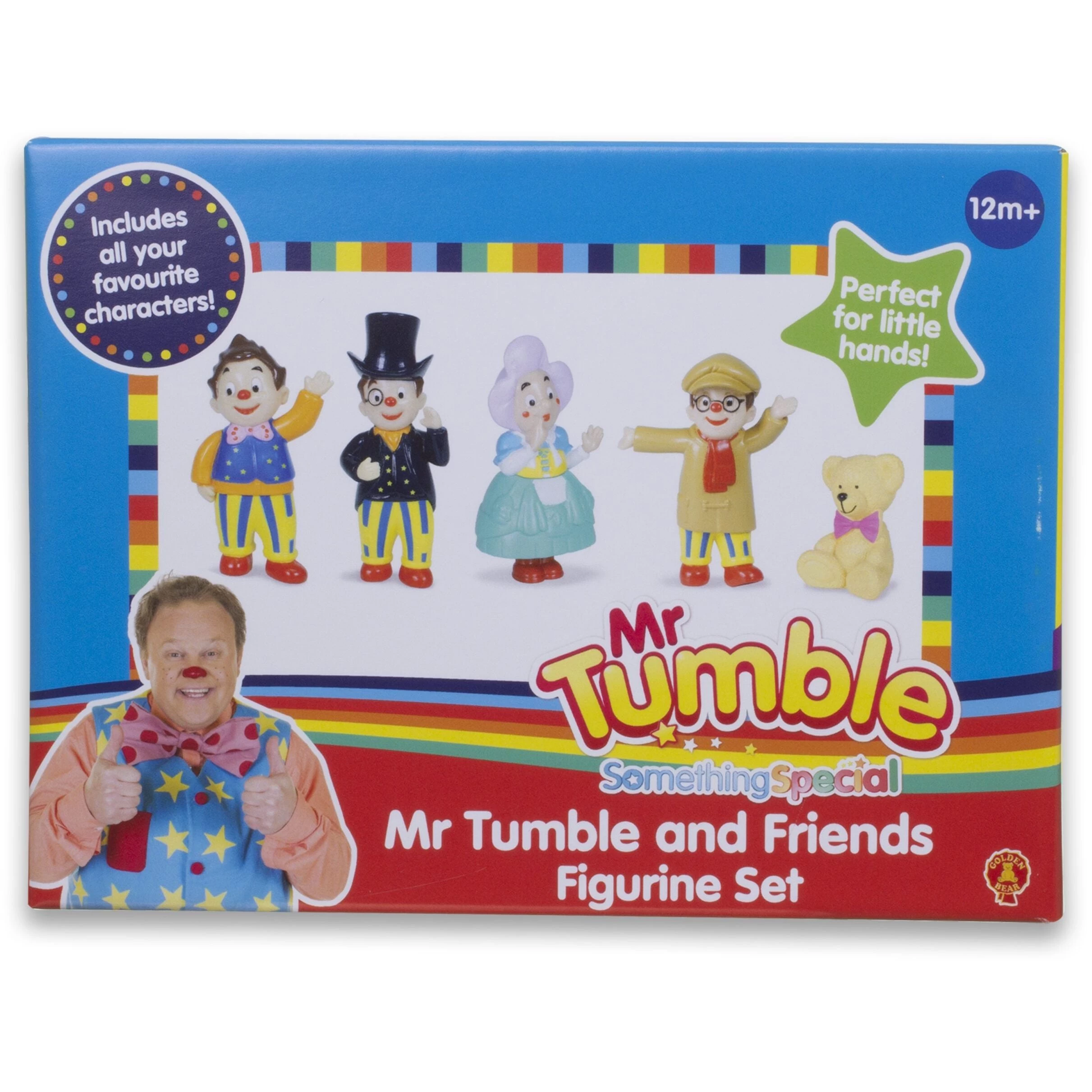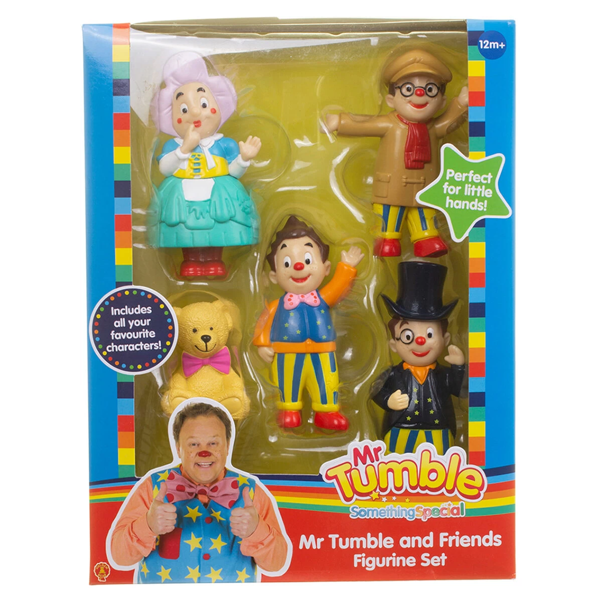 5 brightly coloured figurines with fine detailing. Includes Mr Tumble, Lord Tumble, Grandad Tumble, Aunt Polly (8cm) plus Tumble Ted. All your favourite characters from the Something Special TV show on Cbeebies. Just right for little hands and can easily be picked up and placed for imaginative roleplay. The ideal gift for Mr Tumble fans. Suits children of all ages; 12 months and up.