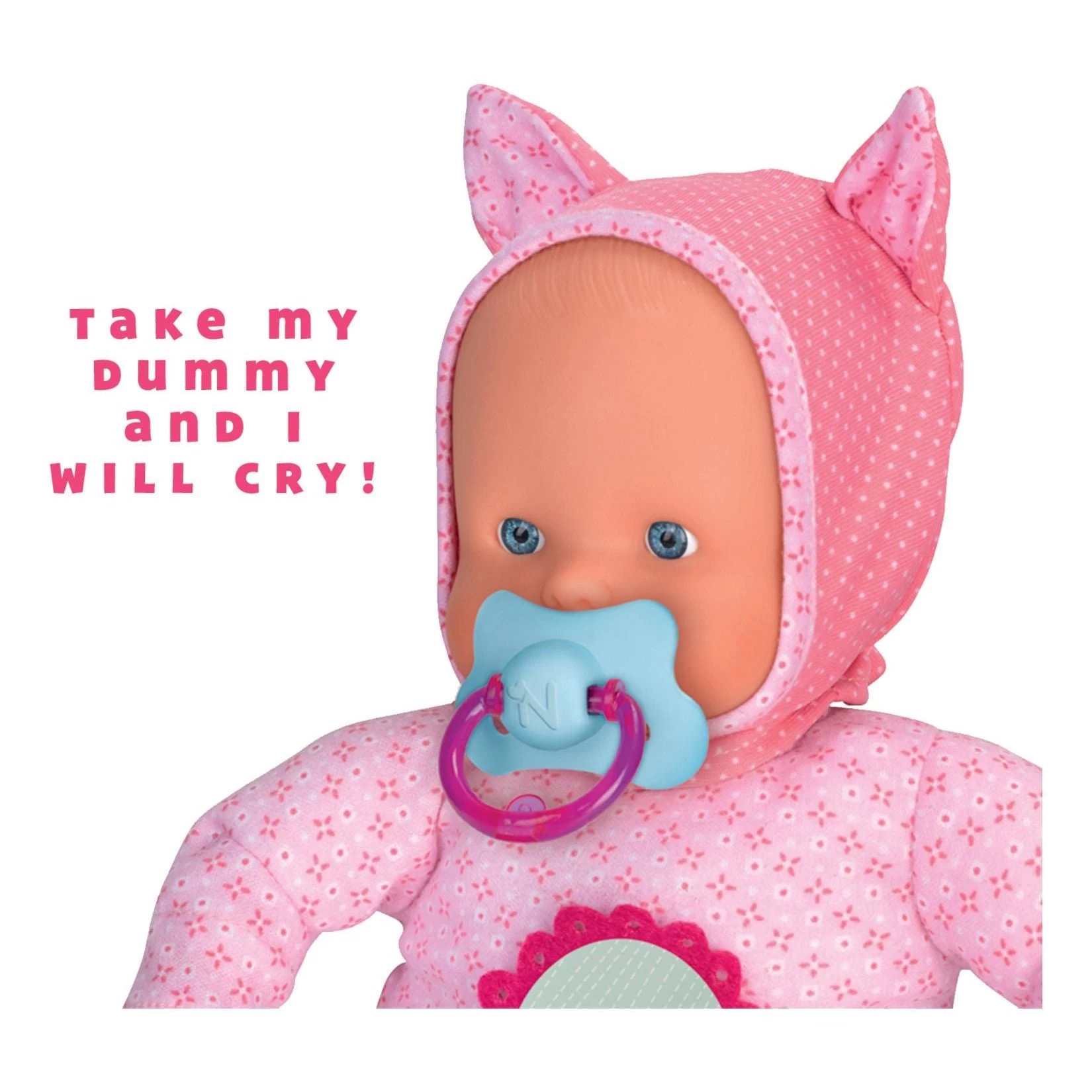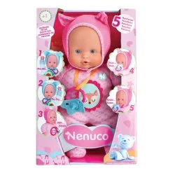 Squeeze the hands or feet and the Nenuco 5 Functions doll will make baby sounds. This 30cm Nenuco can also put their thumb in their mouth as real babies do! Wears cute red and pink clothes and a matching baby hat.