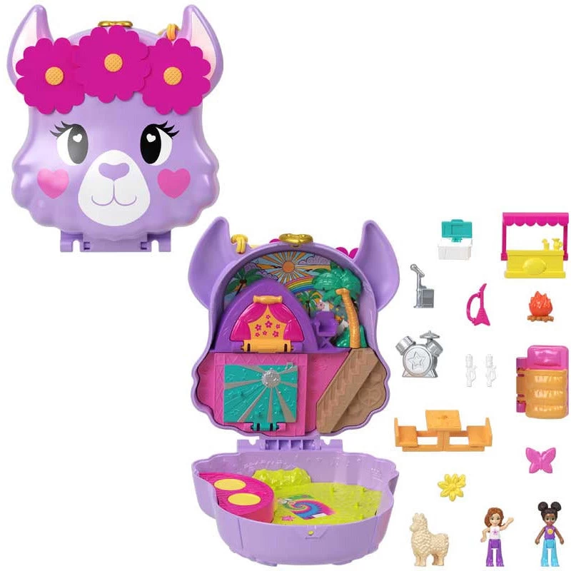 • This Polly Pocket Camp Adventure Llama Compact playset features with an adorable llama head wearing a flower crown decorated with fun-to-touch fabric!