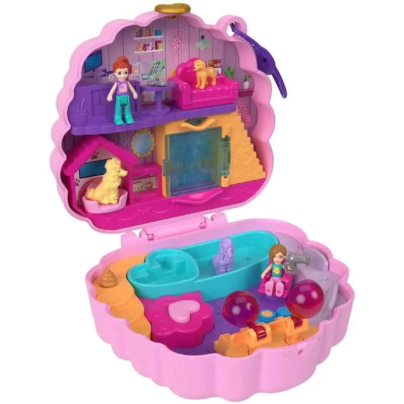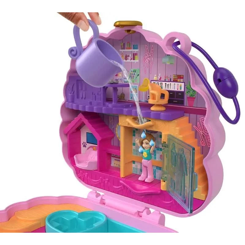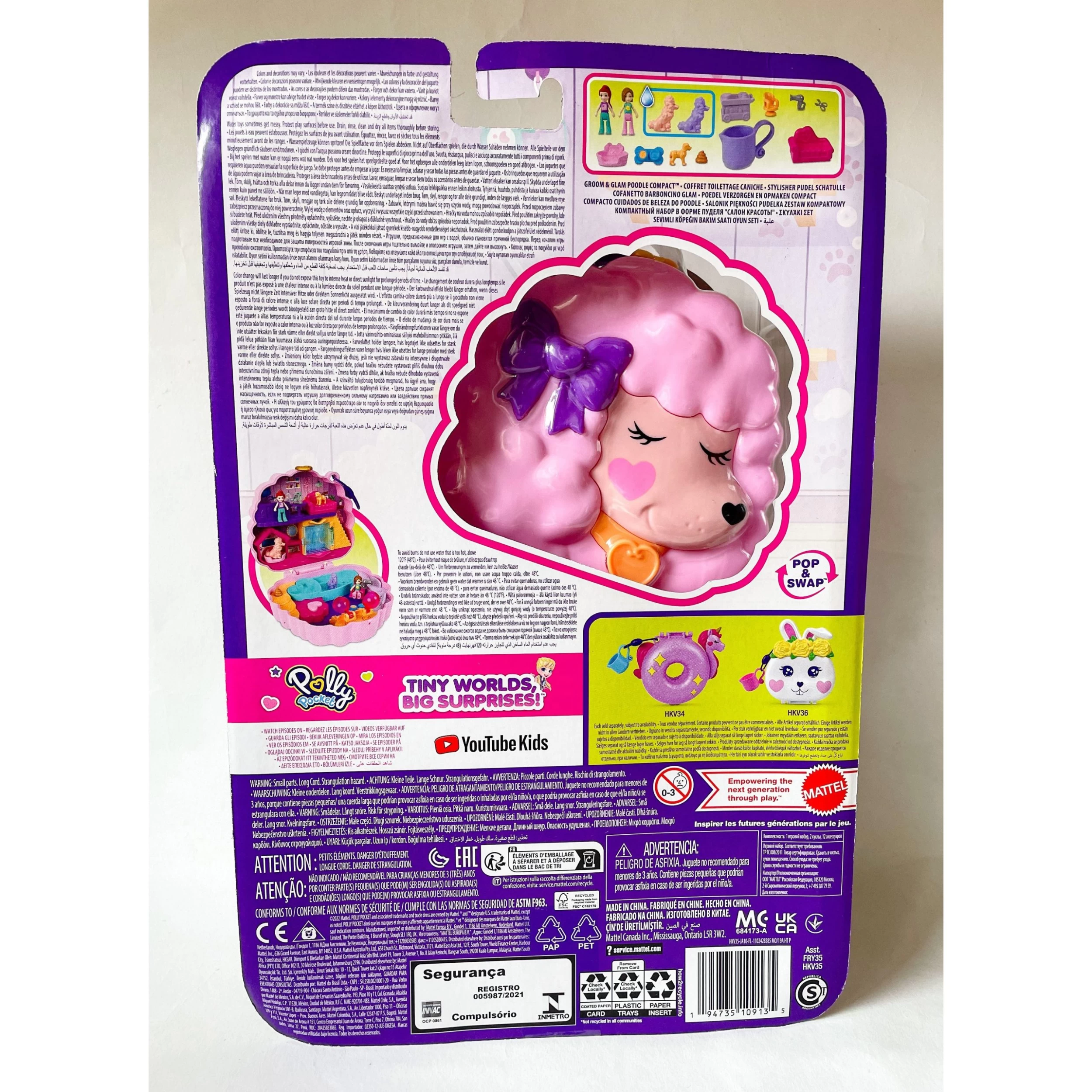 • This Polly Pocket™ Groom & Glam Poodle Compact™ opens to a pet spa theme with Lila™ doll and friend!