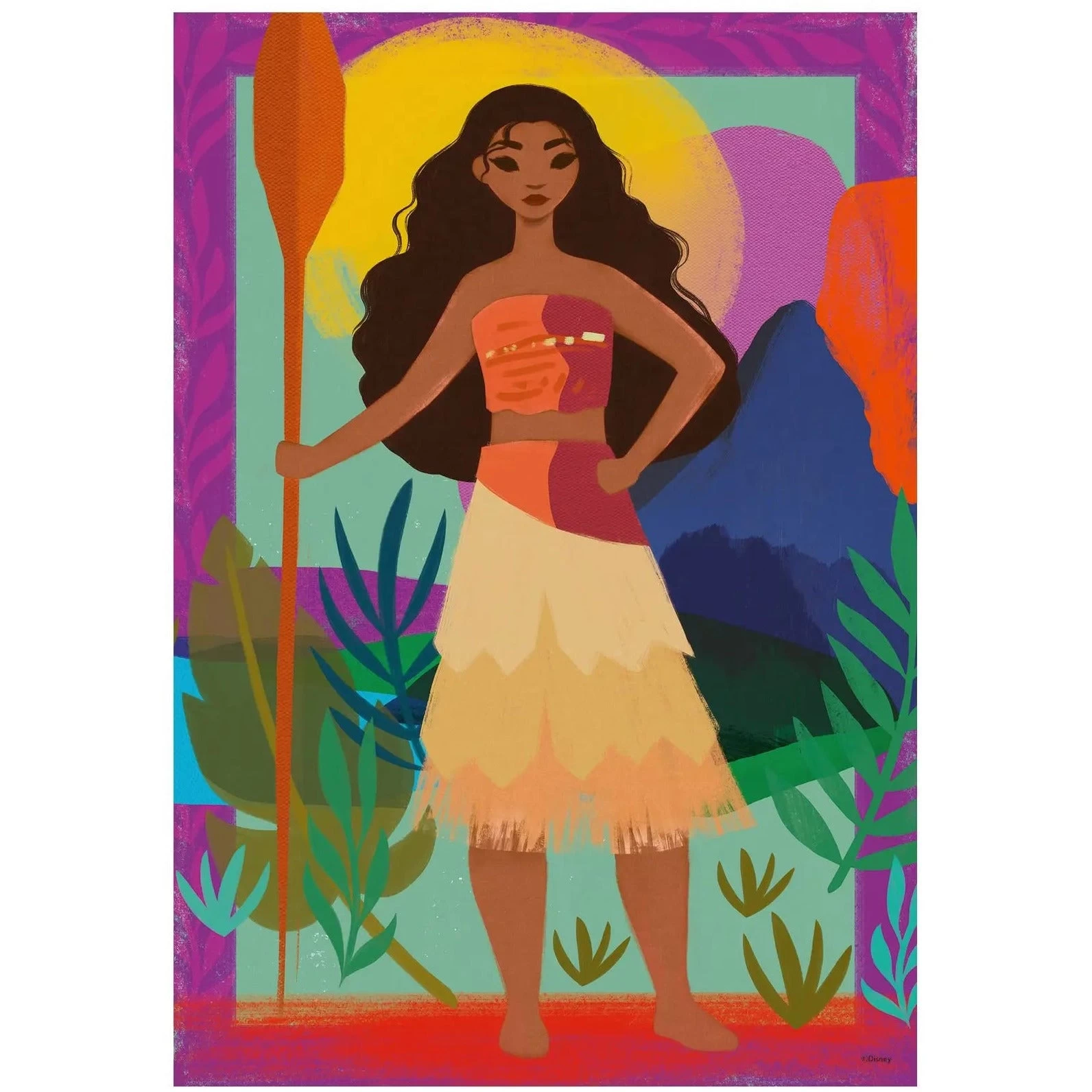 This vivid Moana puzzle celebrates Disney’s 2016 film, with its rich colours that transport us to the islands of the Pacific Ocean. Our scene shows Moana posing with her paddle, and hints at the lush leaves, high mountains and brilliant sunshine of her island home. This jewel-like design would make a great piece of wall art once the puzzle is completed, glued and framed. Unwind, relax and create some mindful moments as you assemble this nostalgic puzzle.