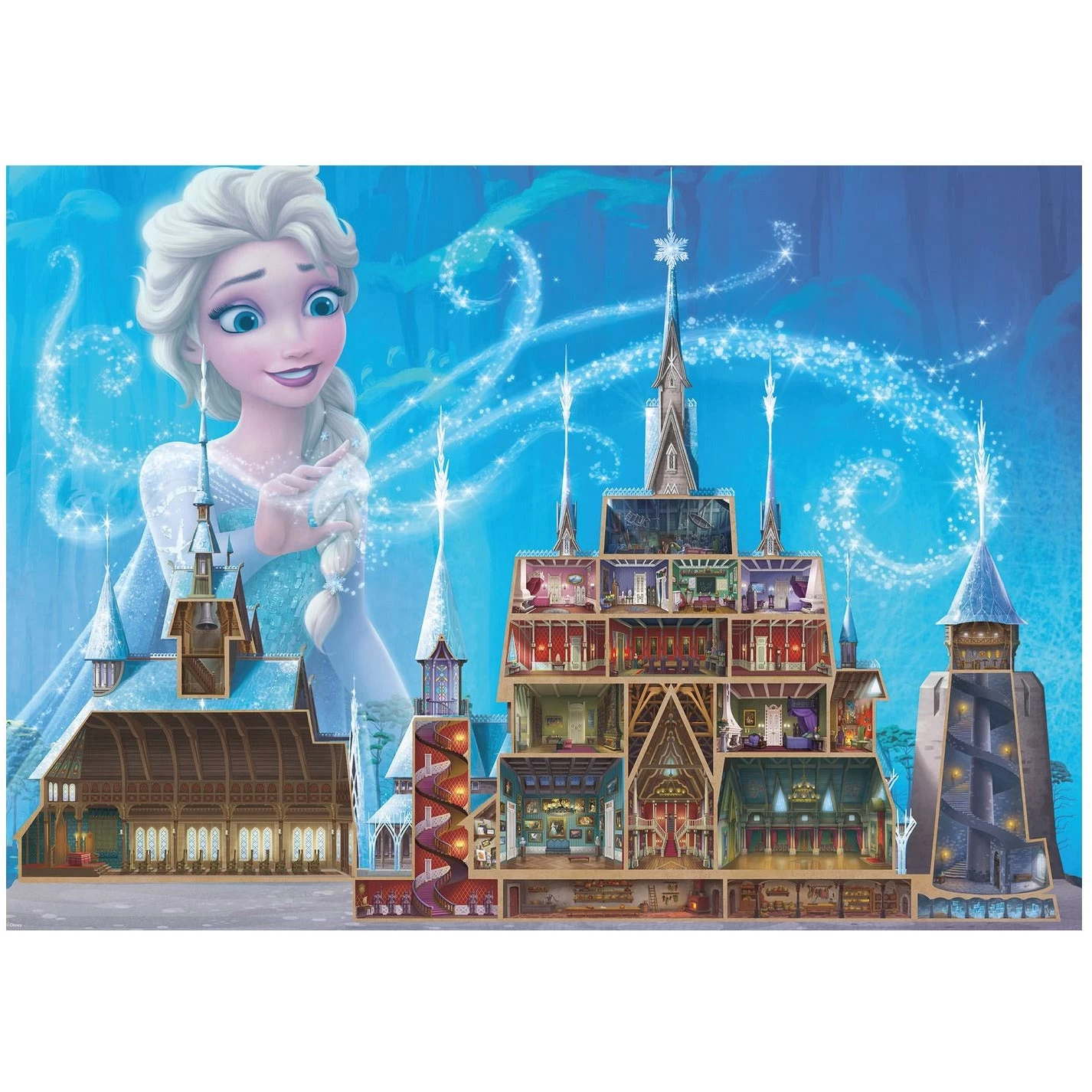Set between cliffs and the sea, Elsa’s castle glimmers in the frosty moonlight. This richly illustrated puzzle lifts the walls of Arendelle, revealing the magnificent timber-framed interior, including the Council Chamber, Great Hall, Library, Portrait Room, Attic and bedrooms. Alongside the main building sits the Chapel and the Guard Tower, whilst Elsa casts a frosty spell across the scene. Capture the magic of Disney’s 2013 animated classic with the stunning and original design. Unwind, relax and enjoy some calming, mindful moments as you assemble this beautiful puzzle.