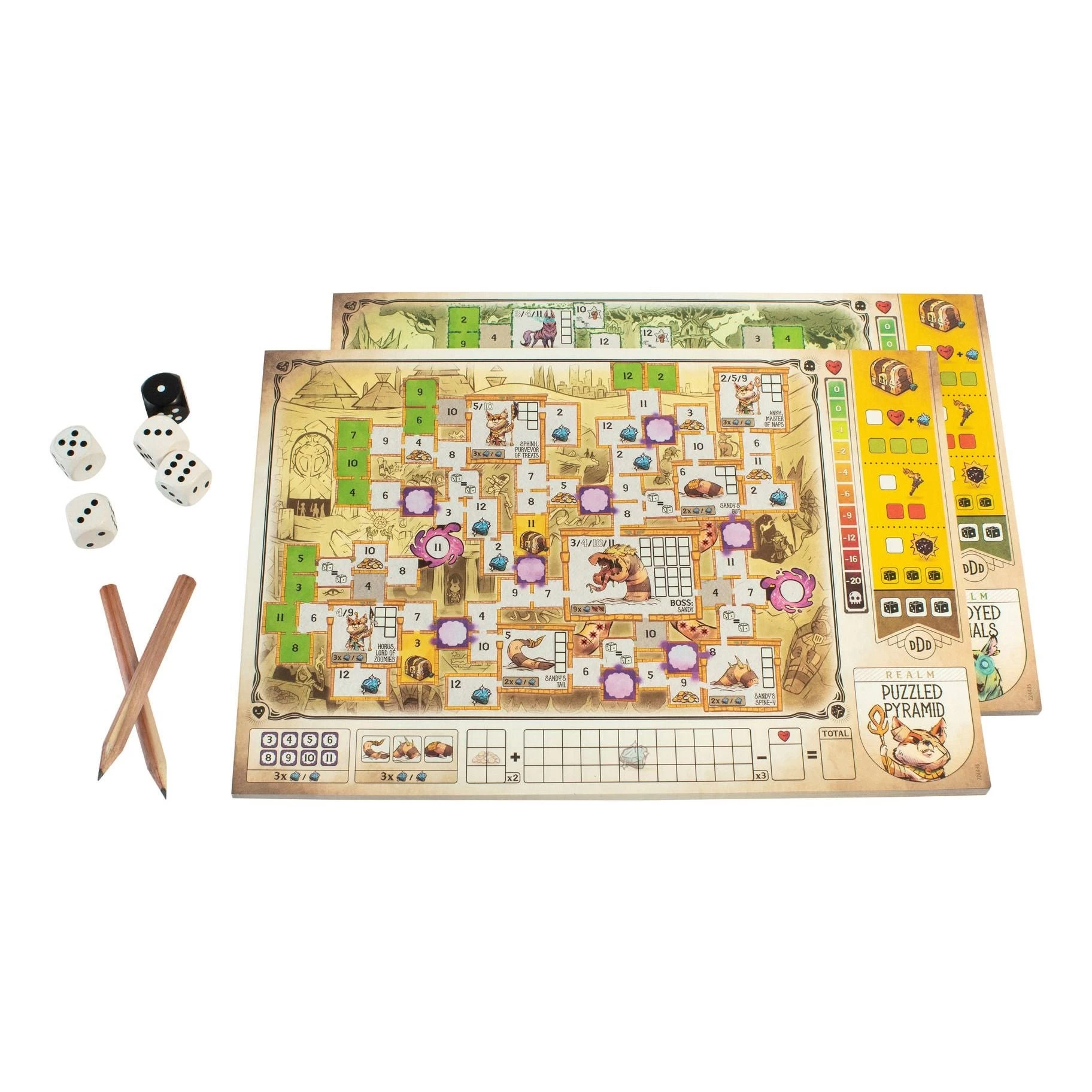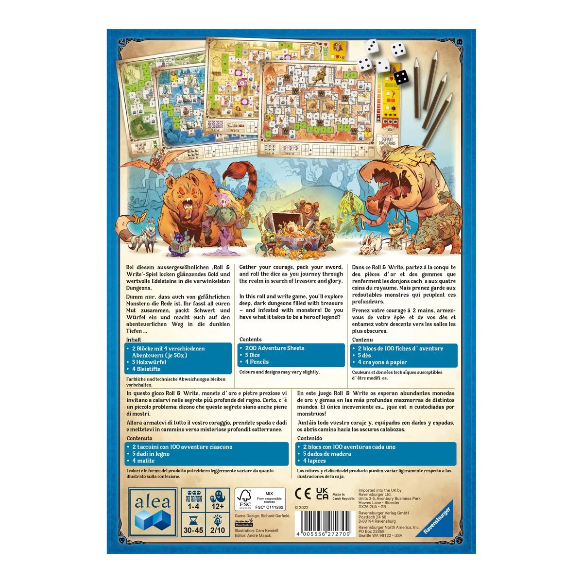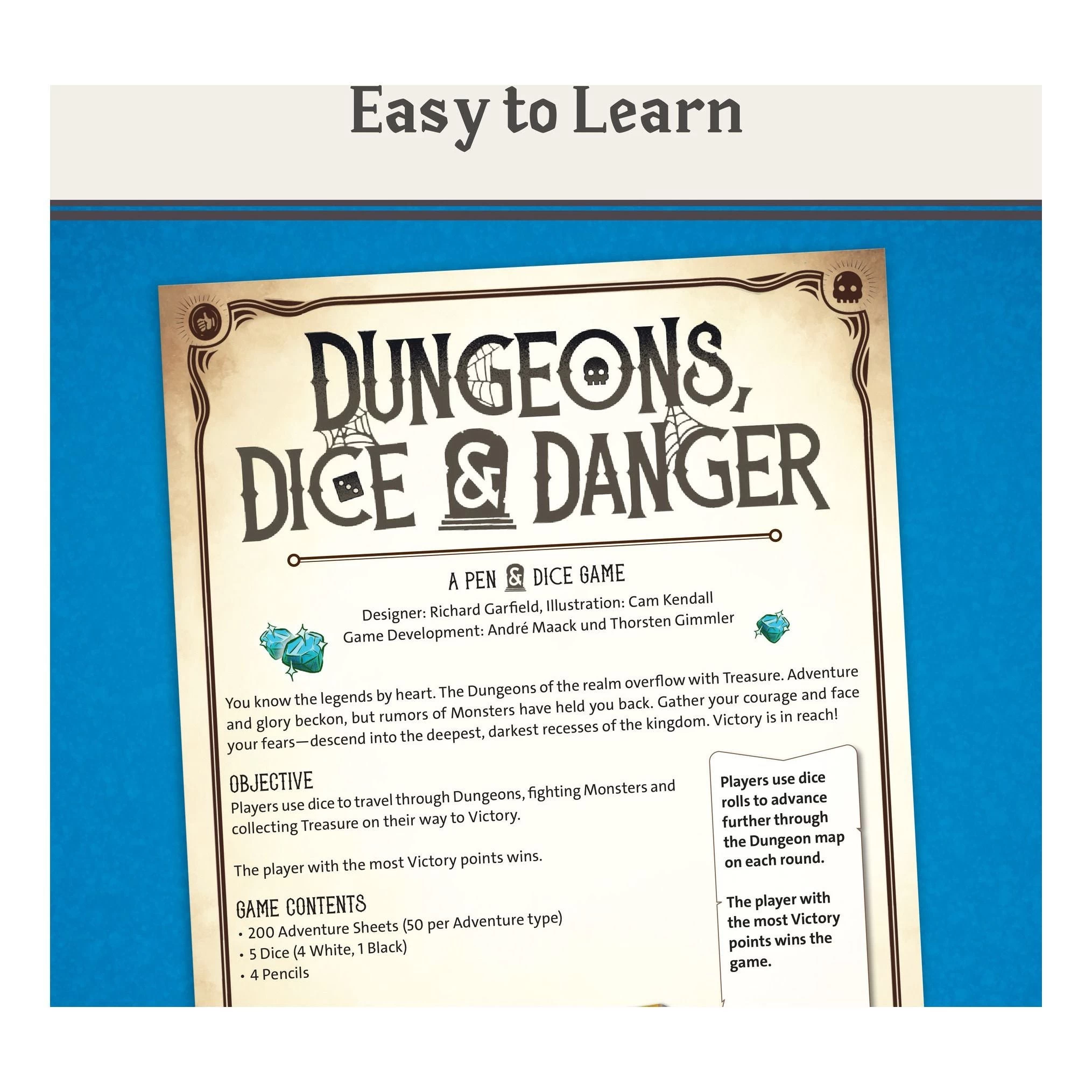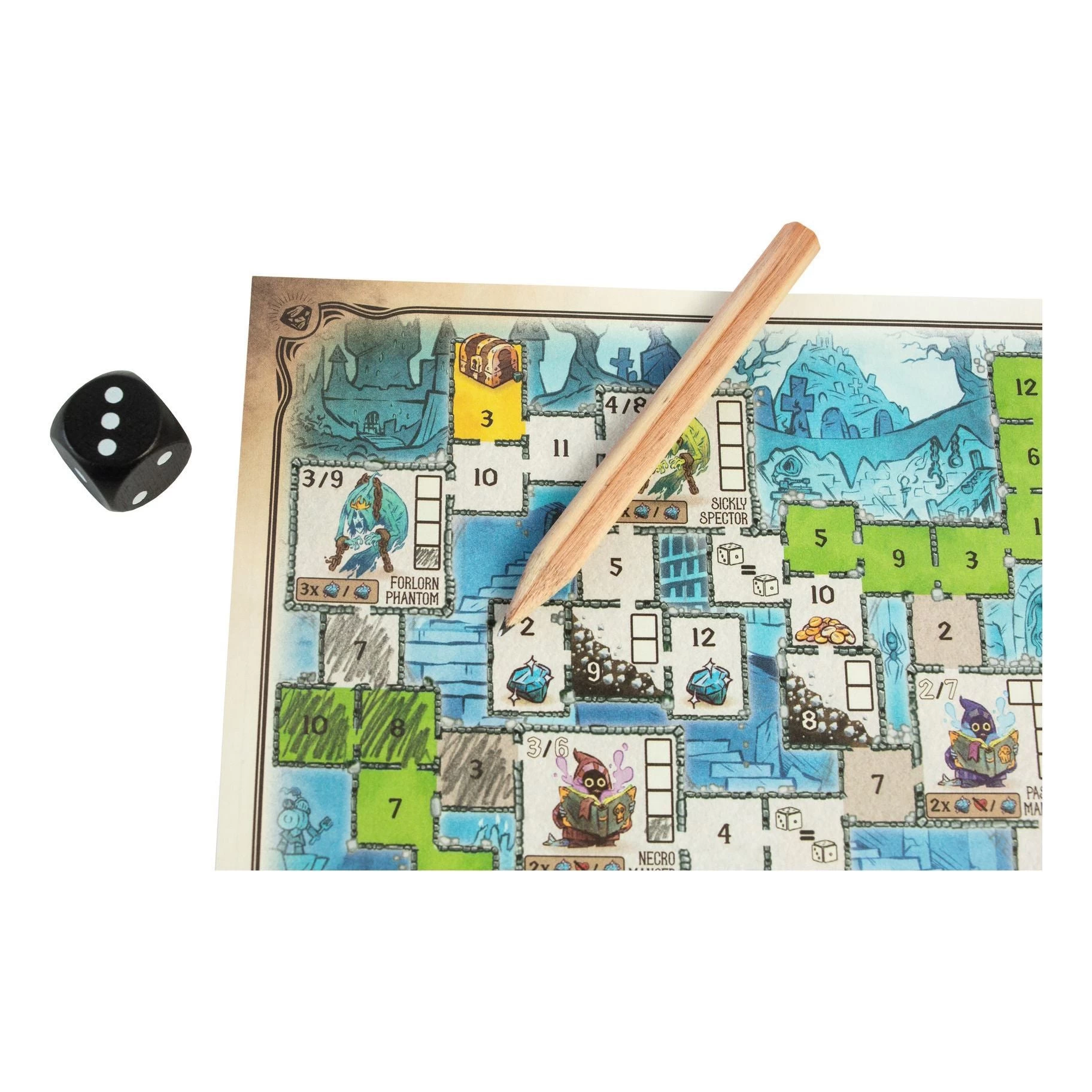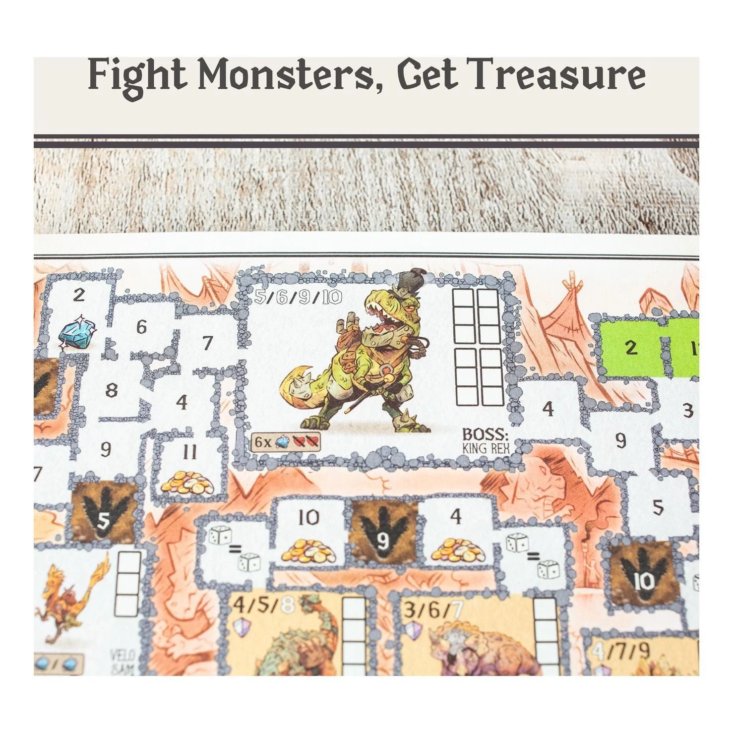 • An exciting roll & write game for adventurers – Roll the dice to travel through 4 different dungeons, marking off your spaces as you go. Defeat monsters and collect the most treasures to gain Victory points to win!