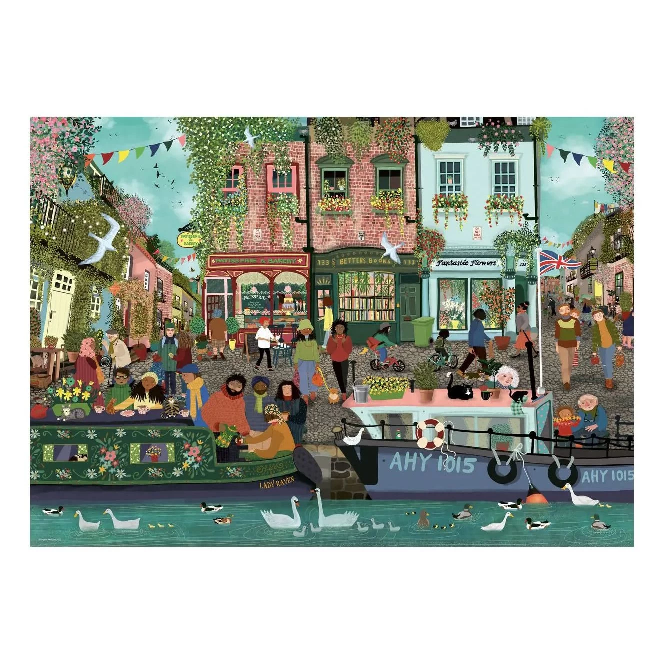 Walking down the cobbled lanes, the locals and visitors alike enjoy meeting and making friends beside the colourful narrowboats. Like-minded boat owners share cups of tea whilst their contented cats bask in the Spring sunshine and the tiny ducklings take their first paddle. The patisserie, florist and bookshop are open for business with their pretty window boxes in full bloom. What a delightful way to enjoy the nomadic freedom of river life, aboard a bohemian narrowboat! So relax as you piece together this bright and vibrant Riverside town 1000 piece jigsaw puzzle. Our 1000 piece jigsaws are crafted with premium quality materials and measure 70 x 50cm when complete. Great for Adults and ideal puzzles for Children 12 years old and up. Fully complies with all necessary UK and EU testing standards. Bestselling puzzle brand worldwide – With over 1 billion puzzles sold, our jigsaw puzzles make ideal gifts for women, great gifts for men and fit perfectly on our puzzle board. Our puzzles use an exclusive, extra-thick cardboard combined with our fine, linen structured paper to create a glare-free puzzle image and give you the best experience possible. #Positivelypuzzling – From fun family times together to long term health benefits and day-to-day mindful moments, there are so many positives about the humble Jigsaw! They make a great birthday gift or smashing Christmas gift.