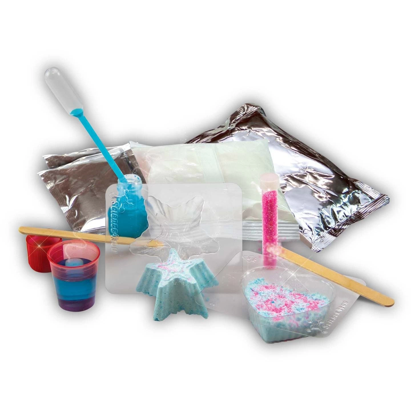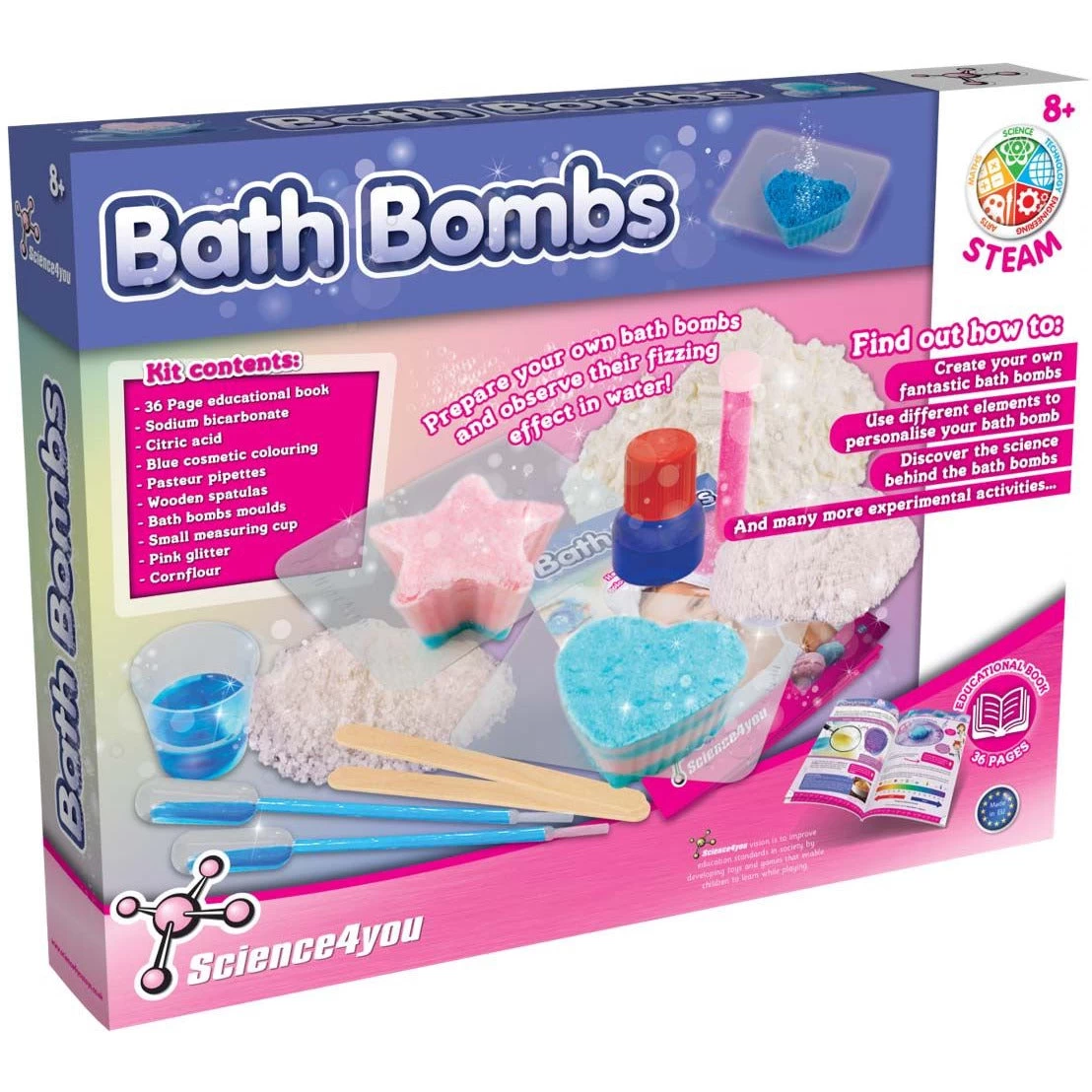 Use the 14 contents included in this science kit for kids aged 8 and learn how to create natural, aromatic, and relaxing bath bombs with different shapes and colours. Learn how to make your own sparkly bath bombs with star or heart shapes. With the 6 experiments and moulds of this bath bomb factory and science lab for children you can create natural bath bombs and discover the science behind these relaxing bath bombs ideal for a spa set for kids. This bath bomb science experiment kit includes an educational book to teach you how to use. This is science toy for children 8 years old inspired by the STEAM methodology (formerly known as a STEM toy). STEAM stands for Science, Technology, Engineering, Arts and Mathematics. These scientific and educational toys help children gain knowledge in these 5 areas, stimulating their skills as they play. This science and craft kit for kids is the perfect scientific Christmas or birthday gift for kids. A perfect bath bomb gift set for girls and boys who love the world of science and cosmetics!