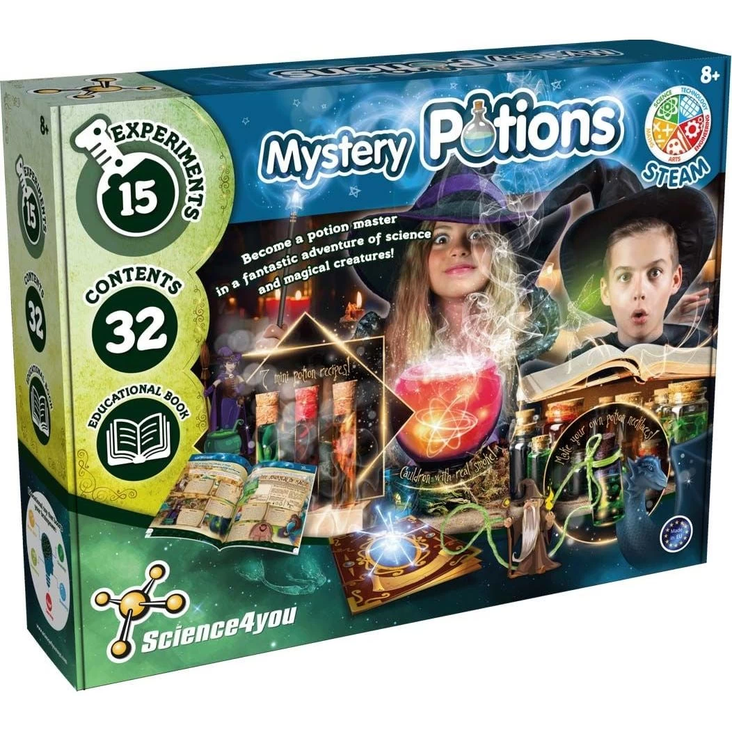 Mysterious Potions, is the new toy from Science4you! Join this fantasy world and learn how to make bubbling or glow-in-the-dark potions, together with several magical creatures and a lot of science! With this toy children get to know the Magic Village, a mysterious place where magic becomes reality. Here they meet Master Smarty, the most experienced wizard in town, and other magical creatures (fairies, witches, goblins, giants, dragons and mermaids) who will teach the new wizard the best magic potions. Includes a magic wand and a cauldron for making potions.