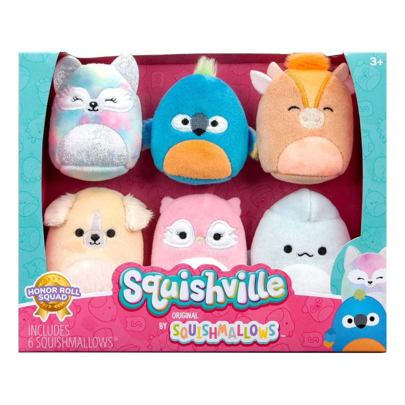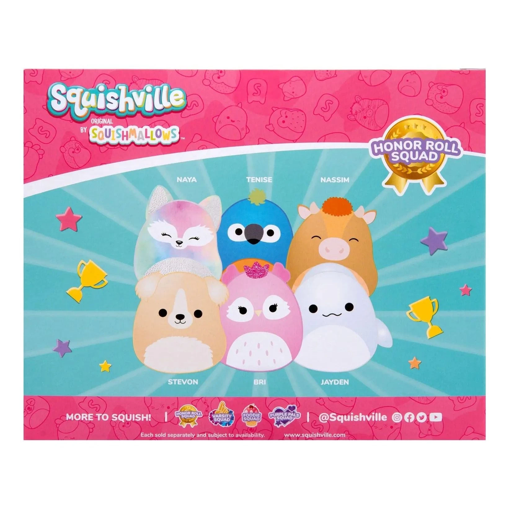 Join the determined and dedicated best friends with the 6-pack Honor Roll Squad! The 6-pack comes with some of your favorite Squishmallows in an exclusive 2-inch size, Stevon the tan Golden Retriever, Nassim the brown Horse with spotted belly, Naya the rainbow tie dye Fox, Tenise the blue-orange Parrot, Bri the pink Owl with a sparkle crown, and Jayden the light blue Beluga Whale! All are made with super soft filling and bursting with personality. Build out the World of Squishville with 2-inch Squishmallows, accessories, Play and Displays, and plush playsets!
