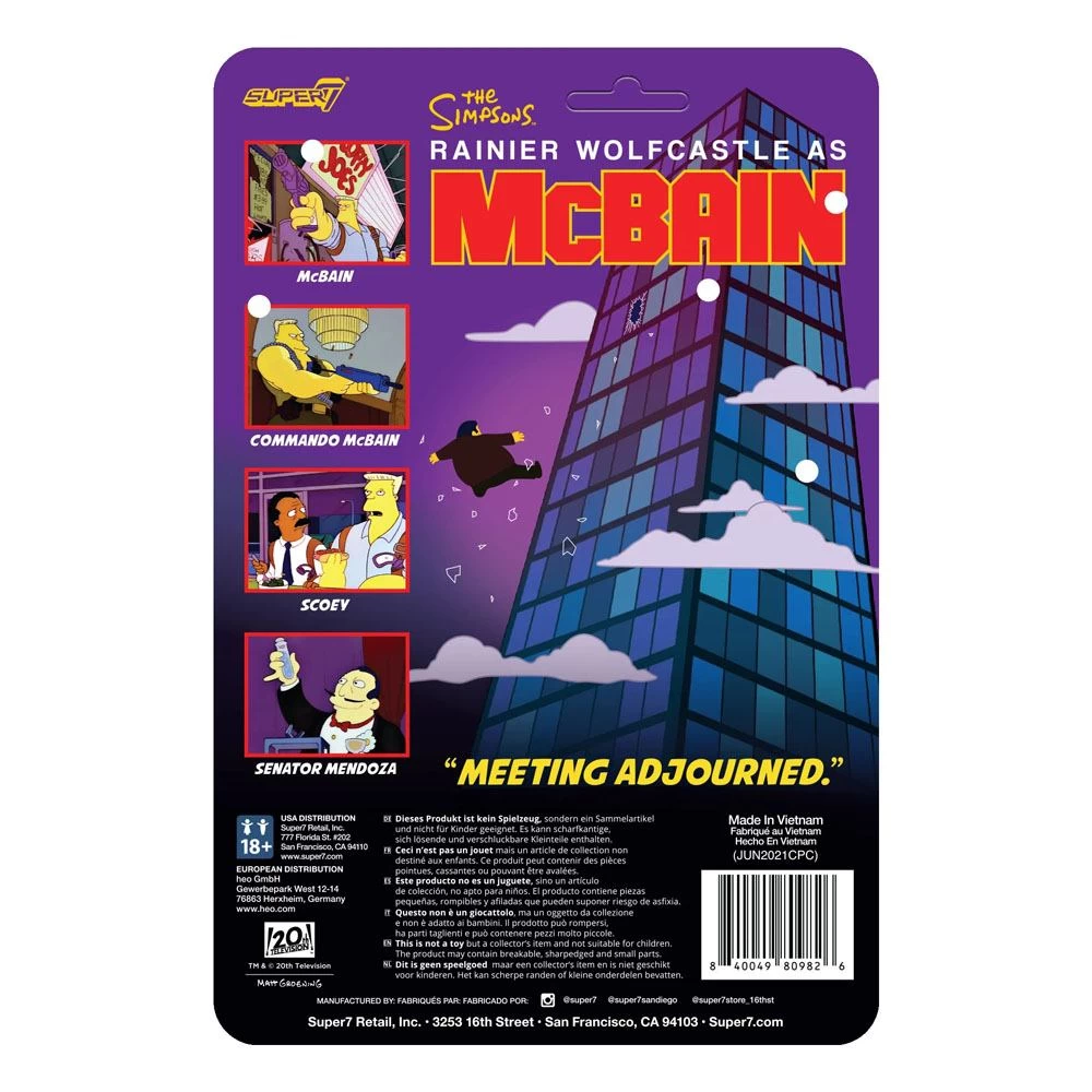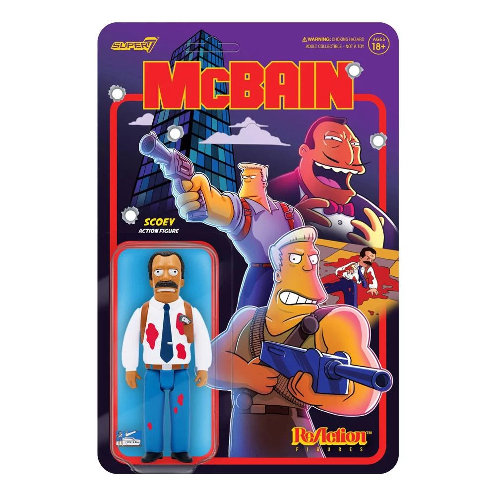 As seen in The Simpsons! This 3.75″ articulated McBain ReAction figure of Scoey shows his grim resolve as he implores McBain to “get Mendoza” with his dying breath. Collect the entire line of The Simpsons McBain ReAction figures!