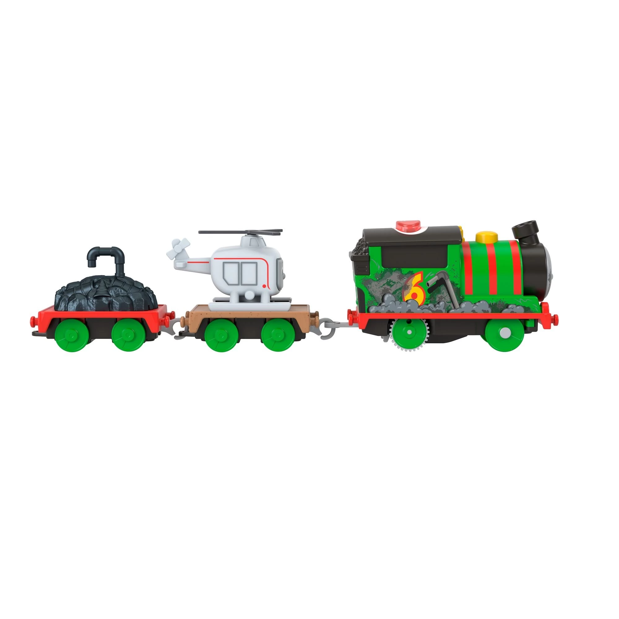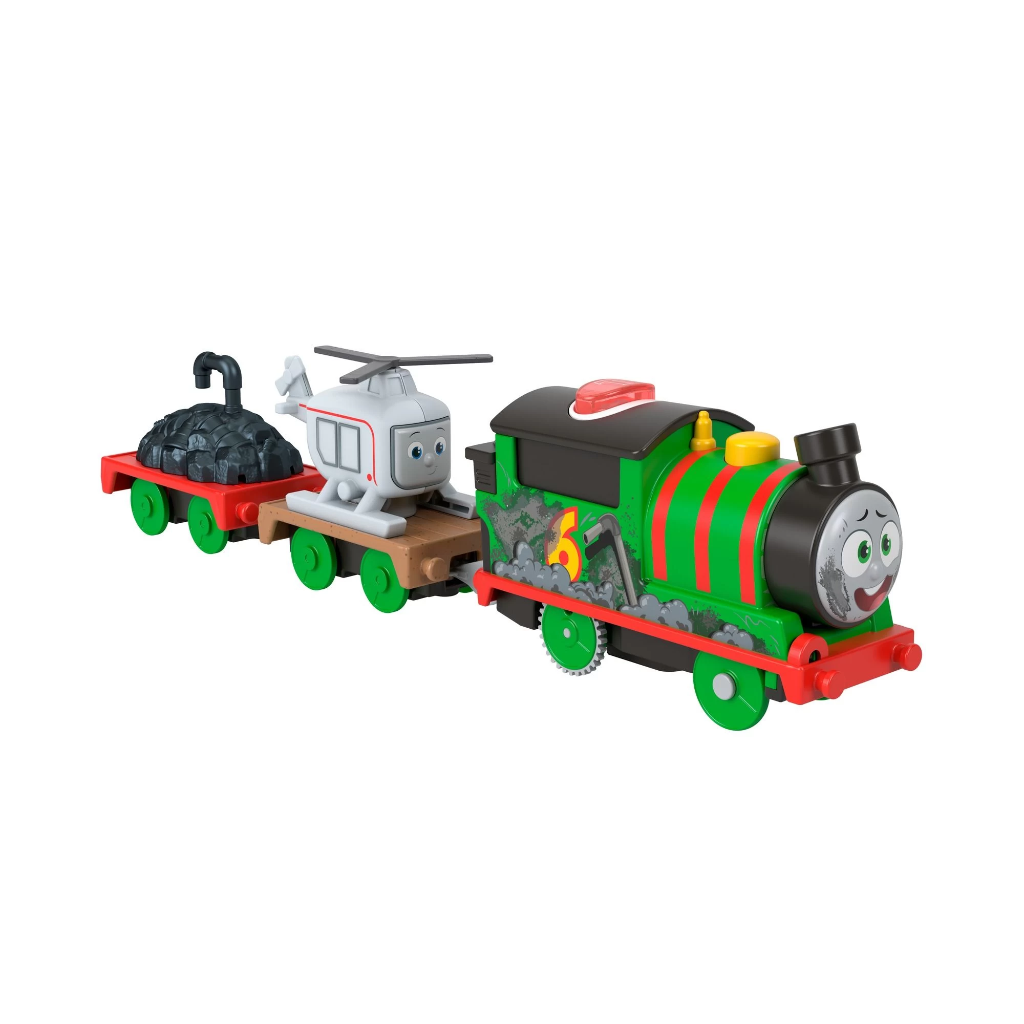 • Motorized toy train featuring a Percy engine with real character phrases and sounds plus Harold the helicopter and a “junk pile” cargo piece