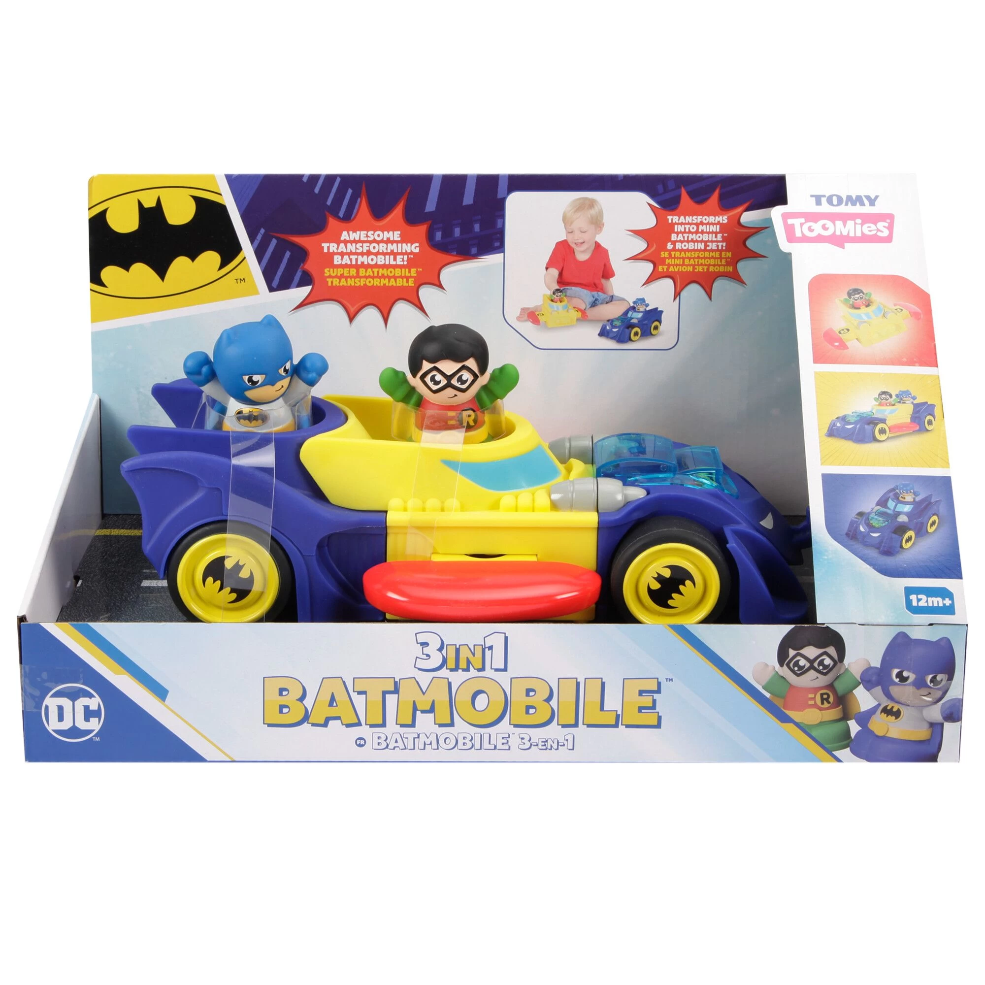 The 3 in 1 Batmobile is another stroke of genius from Wayne Industries. Fresh out of the Batcave comes this extended Batmobile which converts to two more crime-fighting units. Specially designed for little hands on a mission, the parts pull apart easily to reveal Robin’s yellow Batwing Jet with its own extendable wings that pop out either side. The back and front of the Batmobile then click together to form a third vehicle – the Mini Batmobile. Seen the bat symbol and someone needs help? No sweat! Simply push forwards on any smooth surface to rev its engine then release and Batman and Robin race to the rescue! A universal hitch back and front lets you link up with other compatible Toomies vehicles, while colourful beads rattle and pop under the see-through bonnet creating fun engine noises. Batman and Robin figures fit into each vehicle for simple shape-sorting fun. This officially licensed BATMAN toy is strong and sturdy with bright colours and chunky shapes. Ideal for developing gross motor skills, storytelling, logic and problem solving, this collectible range is perfect for imaginative play. No batteries required. Suitable for boys and girls aged 12 months and over.