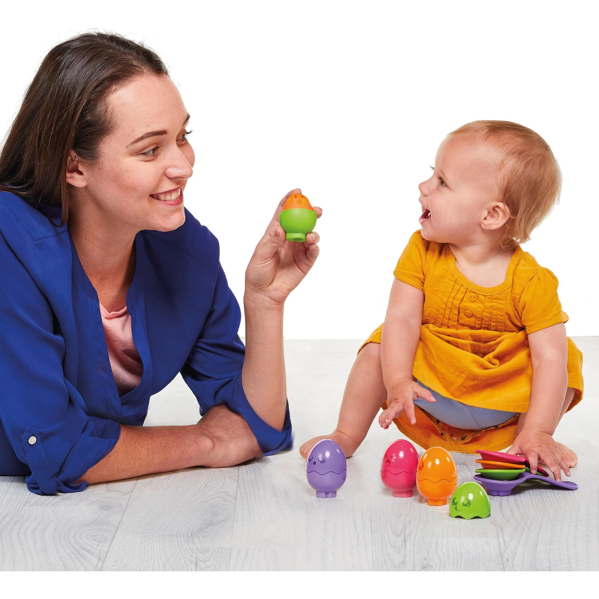 The Toomies Hide & Squeak Egg & Spoon set doesn’t just provide hours of fun – it can keep kids entertained as they grow! Your child will get busy matching the egg tops to their bases, holding the chunky spoons and discovering sounds with the chirping chicks. Each egg has its own funny face and is easy to handle for little hands, designed to stimulate the senses with bright, bold colours and squeaky sounds. A gentle press is all it takes! As children’s motor skills keep developing, little ones will enjoy the challenge of matching the egg colours top and bottom, and placing each egg onto the end of its spoon. They can match spoon with egg by colour, and by sorting the different shapes that fit into the spoons: hidden under each egg is a star, a cross, a square and a heart. As toddlers graduate through their ages and stages, older ones can join with their friends or siblings for an egg-and-spoon race.