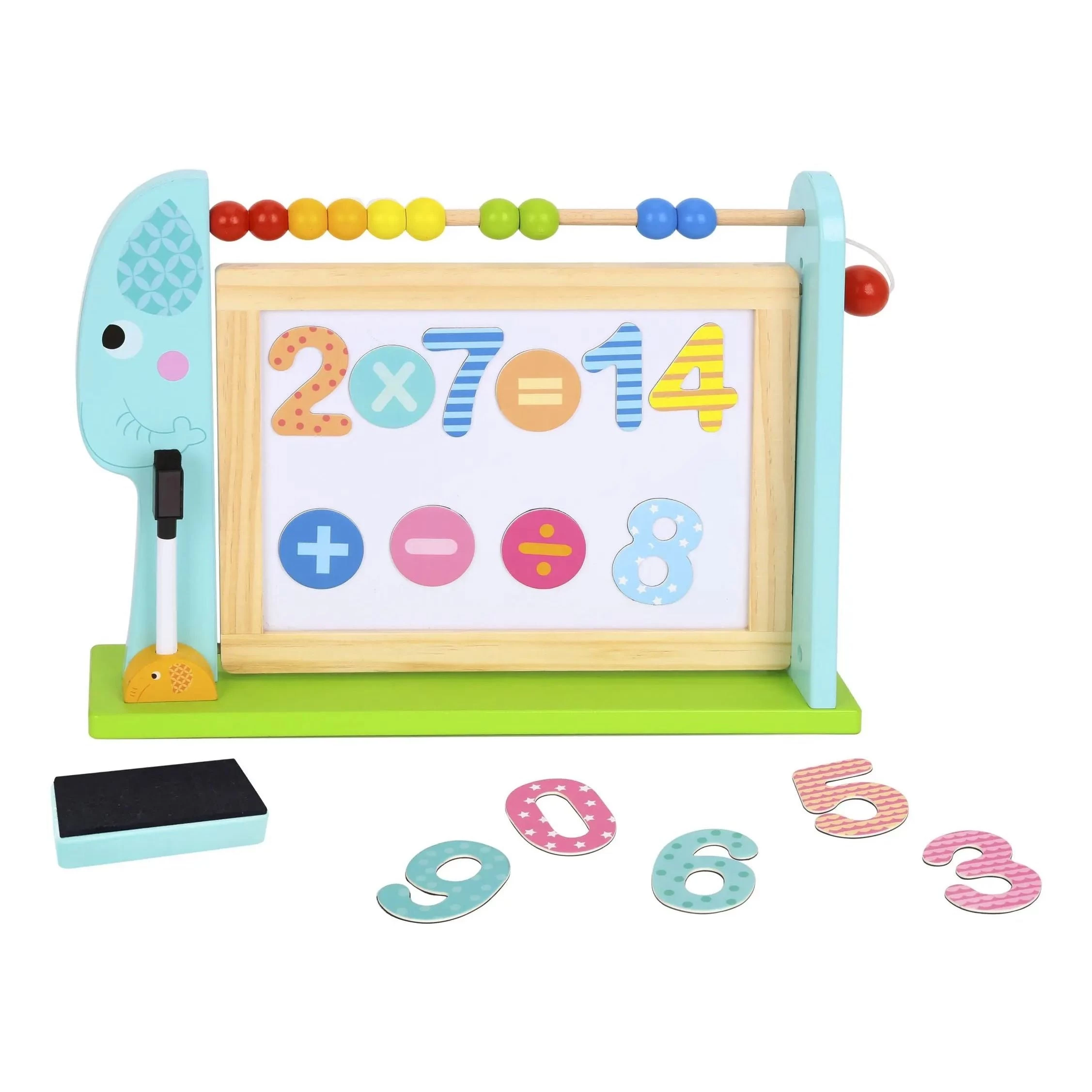 Develop maths and writing skills with the wooden playing board – elephant! One side is a white board, it includes magnets, a marker pen and on the reverse there is a chalk board which comes with a chalk board rubber! The pastel coloured easel also includes an abacus (traditional chinese calculator) at the top which you can move side to side and the beads are in different colours. Suitable for children aged 3 years +