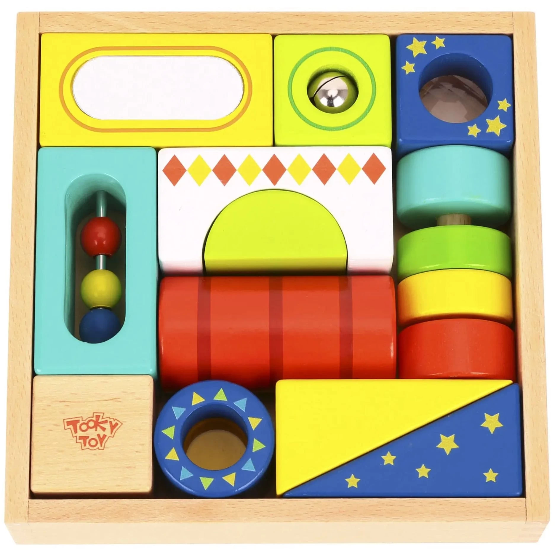 Create different shapes with Tooky Toy’s wooden multifunction block! With bright colours and patterns children can create a variety of different things! There are also blocks which as additional beads inside them to keep the entertainment going! Suitable for children aged 12 months +